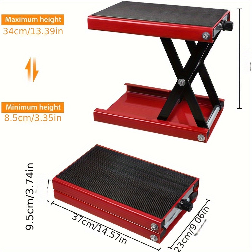 Waarom kiezen voor deze motorlift? Dankzij het stabiele X-frame van staal en de robuuste centrale as kun je de motor op verschillende hoogtes veilig positioneren – van 9,5 cm tot 35 cm. Ideaal voor werkzaamheden aan straatmotoren, cruisers, adventure bikes en ATV’s. De antislip-rubberen toplaag van 35,5 x 22 cm zorgt voor een stevige grip zonder krassen. Bovendien is de lift volledig inklapbaar tot slechts 9,5 cm hoog en daardoor makkelijk op te bergen na gebruik. De meegeleverde metalen handslinger maakt het heffen kinderspel – zonder zweten of gedoe.