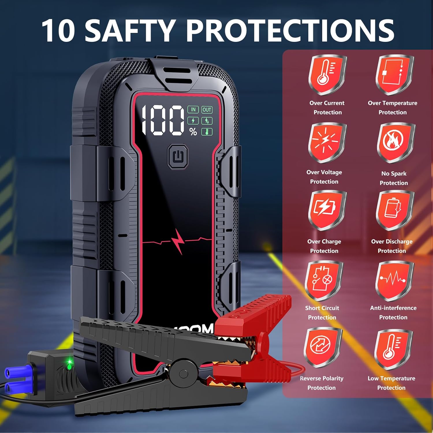 - 【Langdurige prestaties】Dankzij de ultralage zelfontlading behoudt deze jumpstarter zijn lading tot wel 12 maanden in stand-bymodus. Hij biedt tot wel 60 jumpstarts op één lading, zodat u altijd voorbereid bent op noodgevallen zonder u zorgen te hoeven maken over een lege accu.
