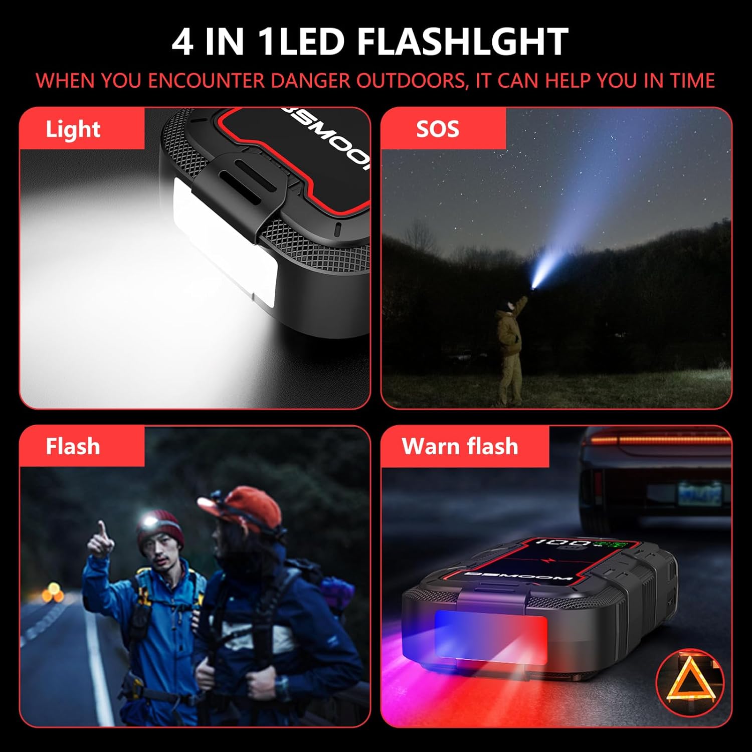 - 【Nood-LED-zaklamp】 De auto-accubooster is voorzien van een heldere LED-zaklamp met vier standen: verlichting, stroboscoop, SOS en waarschuwing. Ideaal voor gebruik 's nachts, noodgevallen langs de weg of buitenavonturen. De zaklamp kan tot 48 uur continu branden en biedt betrouwbare verlichting wanneer u die het meest nodig hebt.