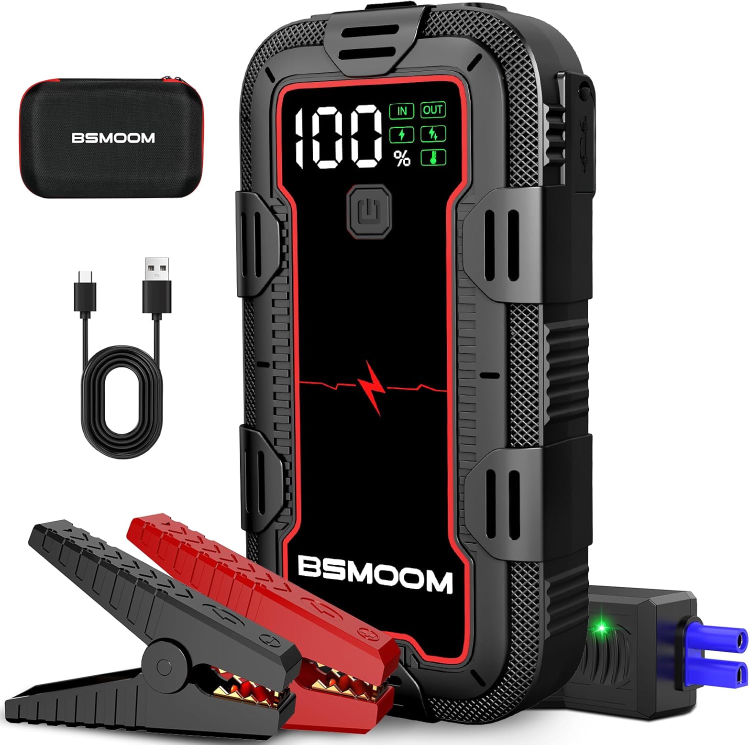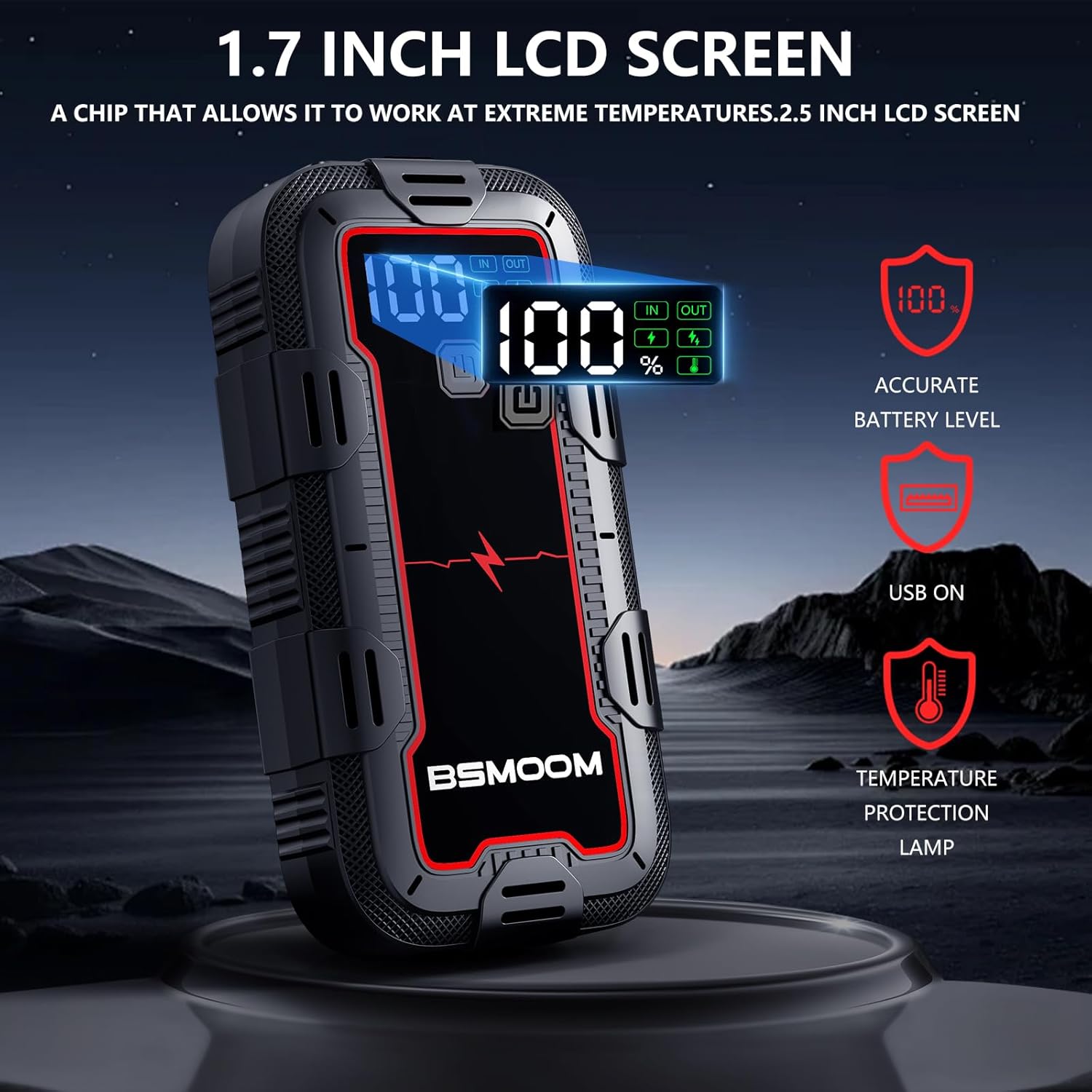 - 【5000A Peak Auto Jump Starter】De BSMOOM 5000A Peak Auto Jump Starter levert een krachtige piekstroom van 5000A en kan alle benzinemotoren en dieselmotoren tot 10 liter binnen enkele seconden starten. Versterkte slimme klemmen en 12V-compatibiliteit zorgen voor een snelle en betrouwbare start, zelfs bij extreme temperaturen van -15,6 °C tot 60,0 °C, perfect voor zware voertuigen zoals vrachtwagens, boten en motoren.