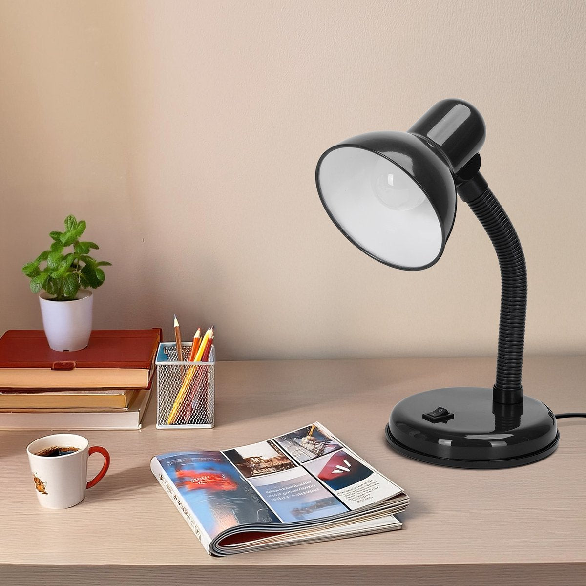 Deze Aigostar bureaulamp heeft een geverfde plastic basis en metalen kap, flexibele slanghals en een AAN/UIT-schakelaar op de basis voor uw gemak. Perfect voor kantoor, kinderkamer of studentenhuis!
