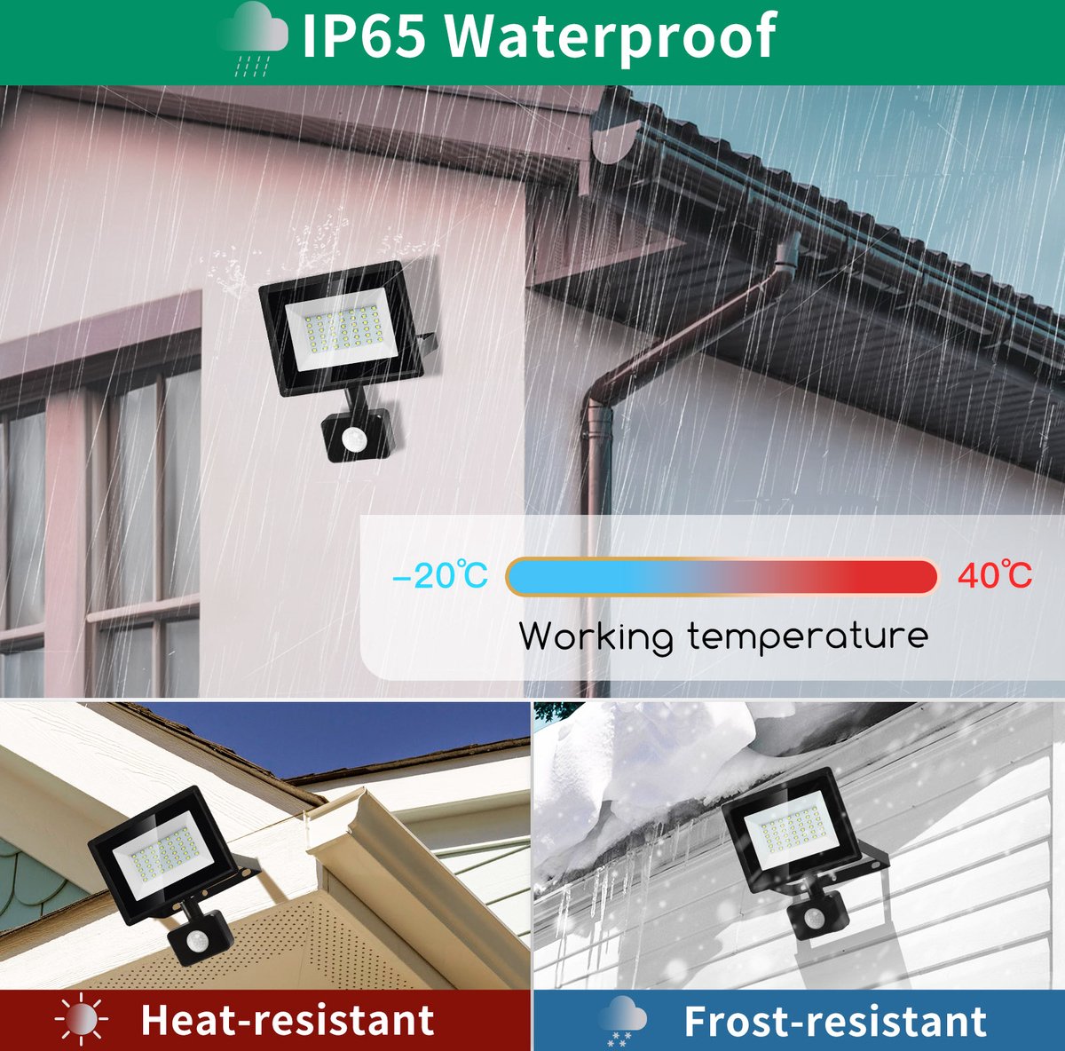 IP65 waterdichte classificatie voorkomt dat de schijnwerper wordt blootgesteld aan extreme weersomstandigheden, zoals regen, sneeuw of een omgeving met hoge temperaturen. De outdoor schijnwerper verlicht een groot gebied voor uw commerciële of residentiële eigendom. Hij is geschikt voor tuinen, werven, garages, villa's, daken, gebouwen, enz.