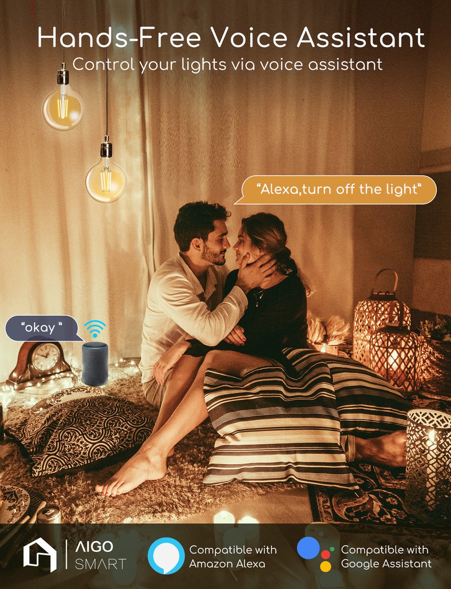 Download gewoon de gratis "Aigosmart"-app, sluit de slimme lamp aan op je 2.4GHz WiFi en je kunt deze overal bedienen (WiFi + Bluetooth maakt koppelen eenvoudig en gemakkelijk). Bovendien is deze slimme lamp compatibel met Alexa en Google Assistant voor spraakbesturing (let op: niet compatibel met 5GHz Wi-Fi).