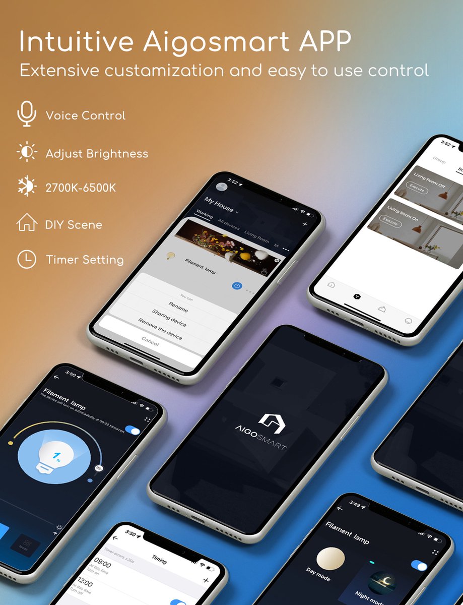 Ga aan de slag met eenvoudige slimme verlichting met deze Aigostar smart vintage gloeilampen. Met behulp van wifi, zonder de Hue Hub, kun je maximaal 10 lampen in 1 kamer bedienen. Bedien je verlichting met de aigosmart-app of met je stem via de Alexa of Google Assistant. Stel schema's, timers, dimmen en meer in die van elk huis een slimme woning maken!