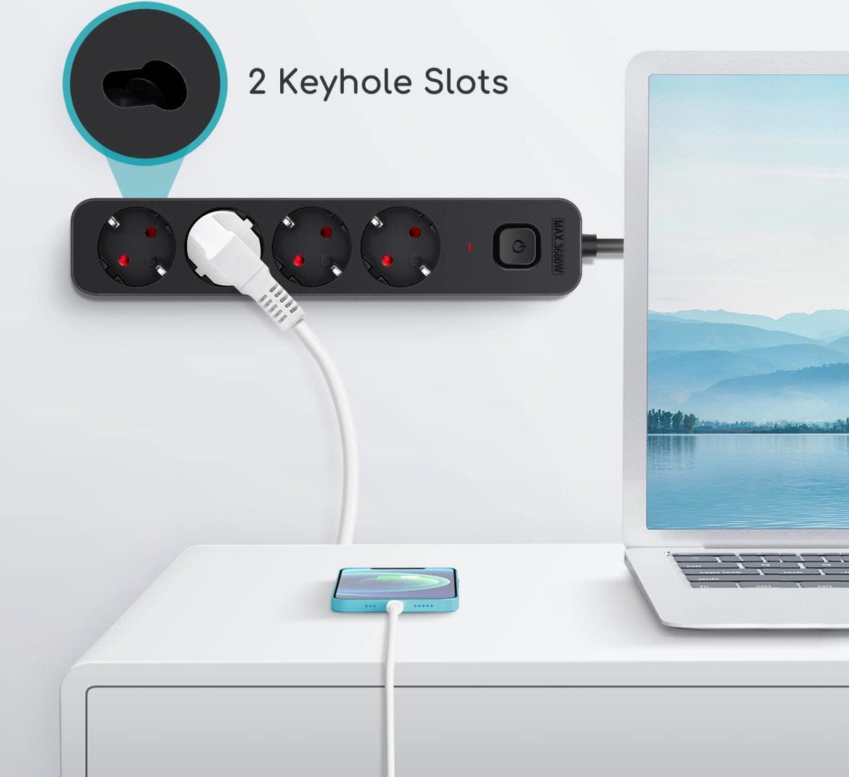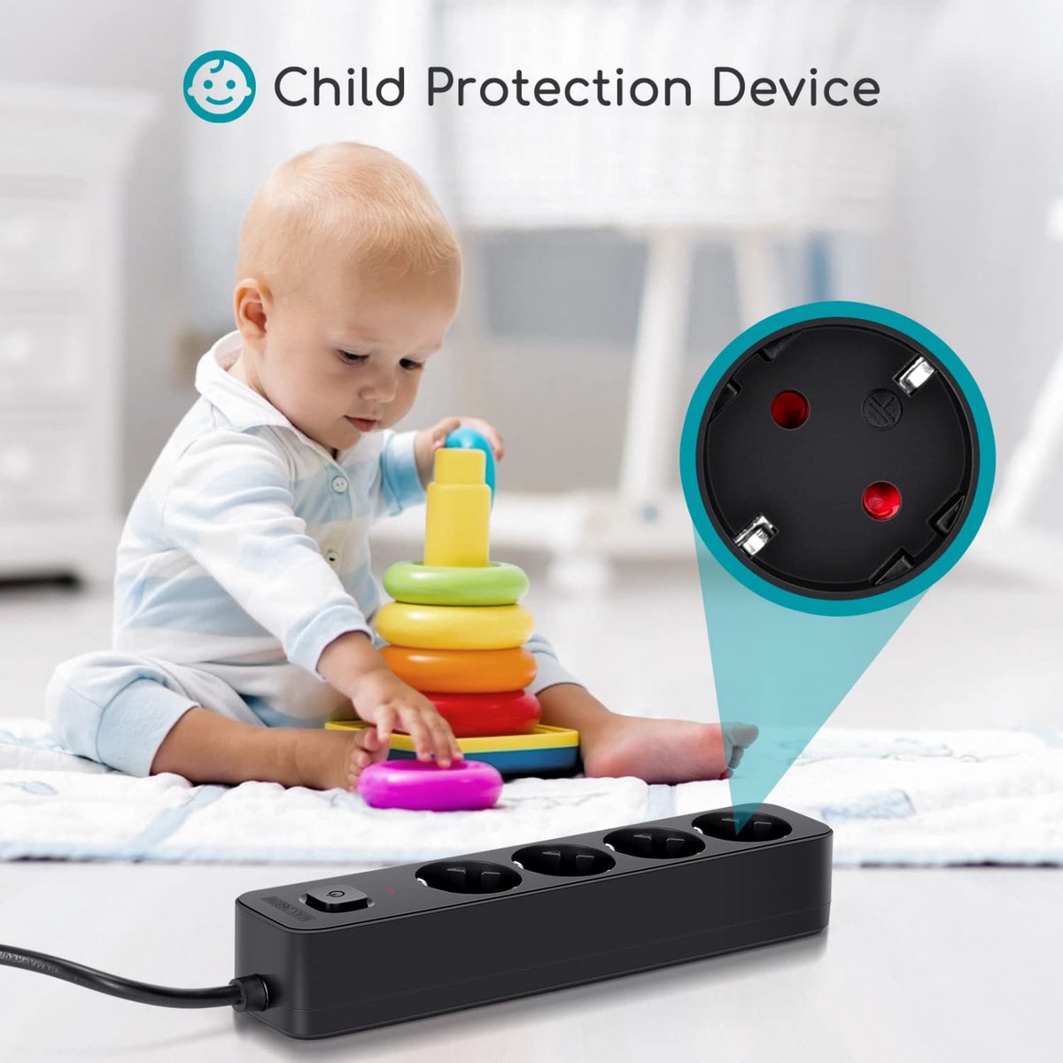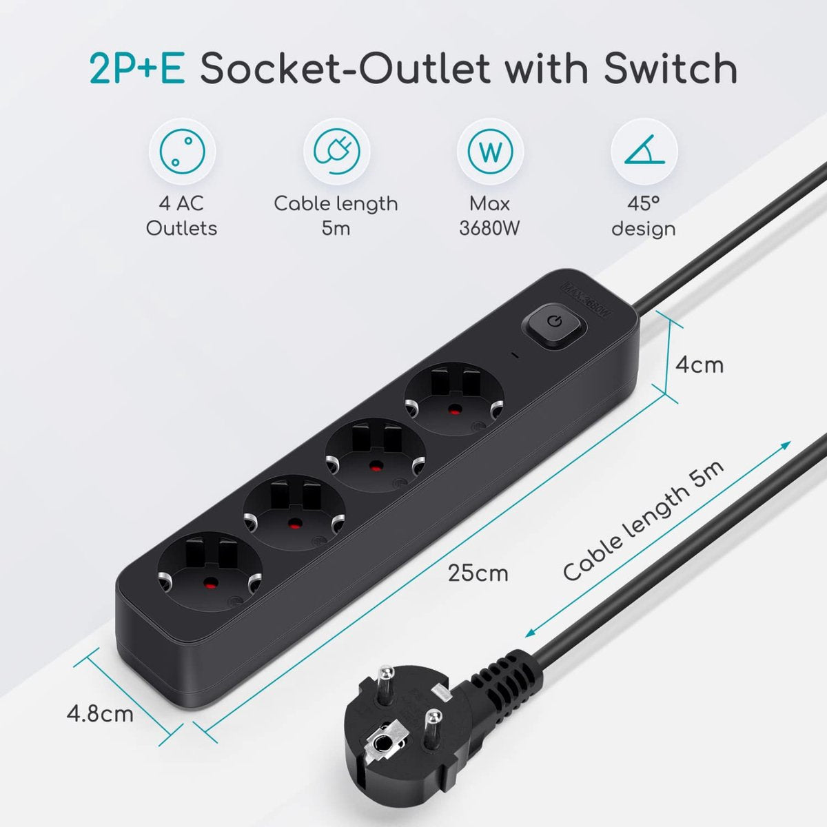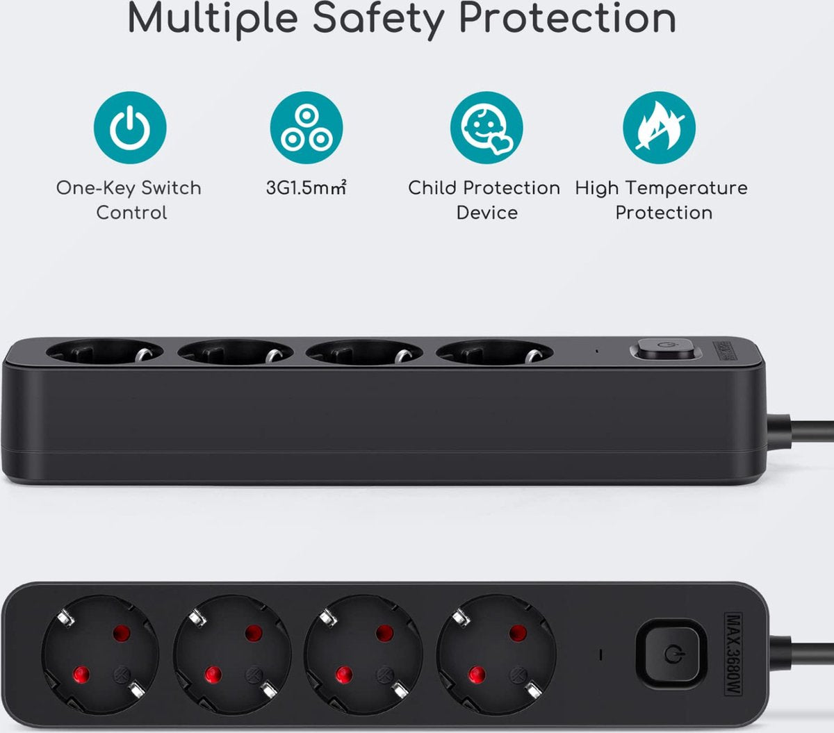 Dankzij de 4-voudige stekkerdoos van Aigostar kom je in huis nooit meer stopcontacten tekort. De stekkerdoos is voorzien van een verlengsnoer van 5 meter, zodat je het stopcontact kunt uitbreiden en verleggen naar een plek die je beter uitkomt. Door de handige schuine plaatsing van de stopcontacten kunnen er makkelijker haakse stekkers op worden aangesloten.