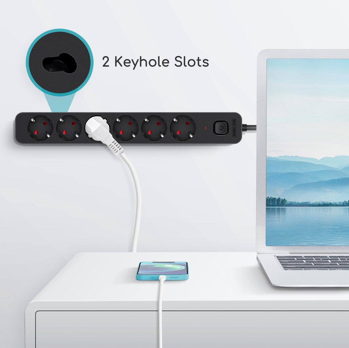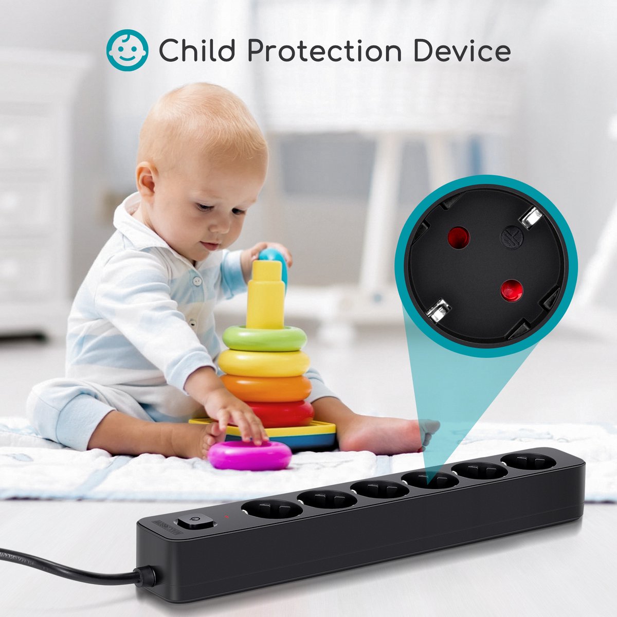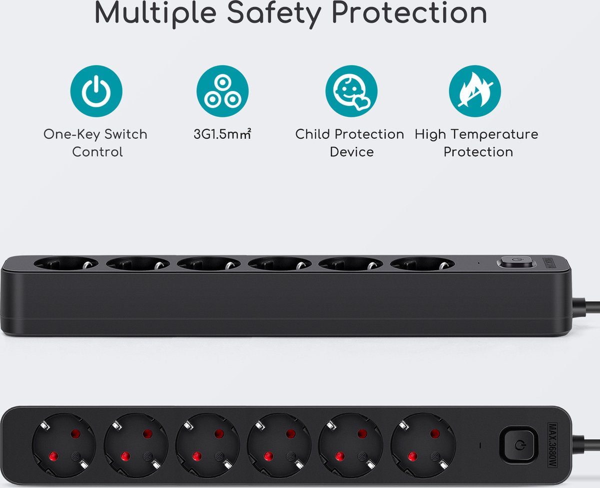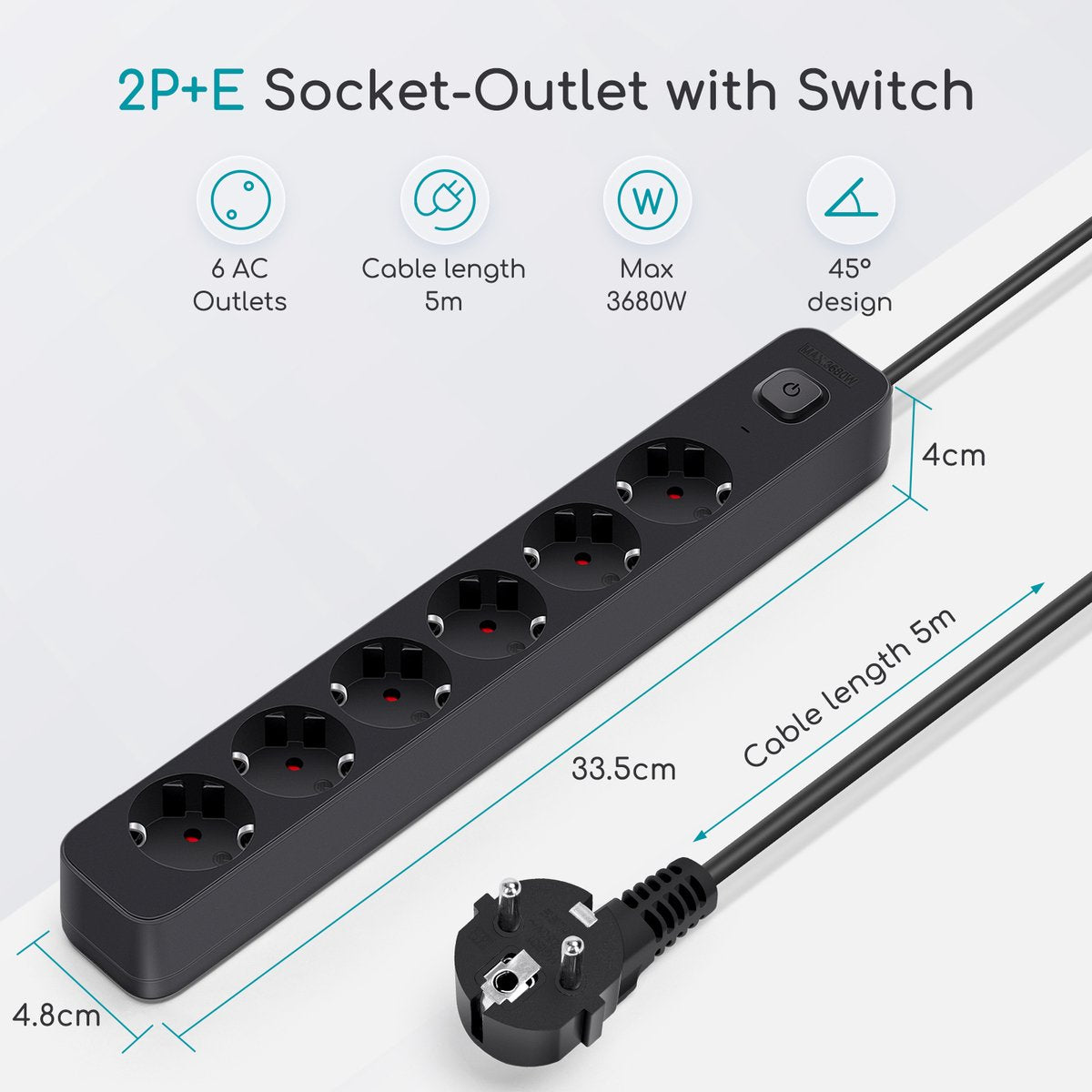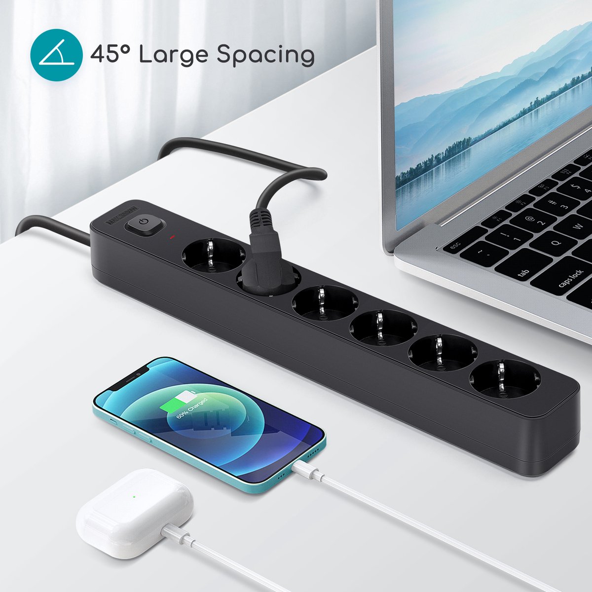 Dankzij de 6-voudige stekkerdoos van Aigostar kom je in huis nooit meer stopcontacten tekort. De stekkerdoos is voorzien van een verlengsnoer van 5 meter, zodat je het stopcontact kunt uitbreiden en verleggen naar een plek die je beter uitkomt. Door de handige schuine plaatsing van de stopcontacten kunnen er makkelijker haakse stekkers op worden aangesloten.