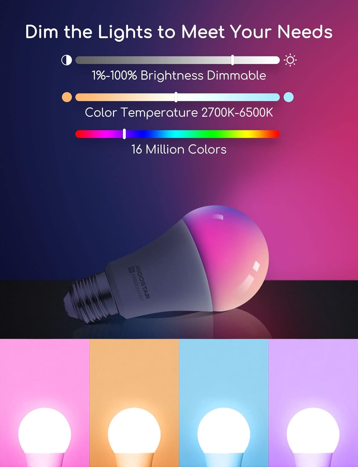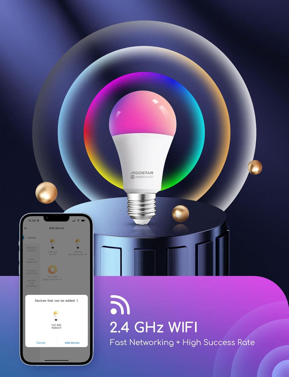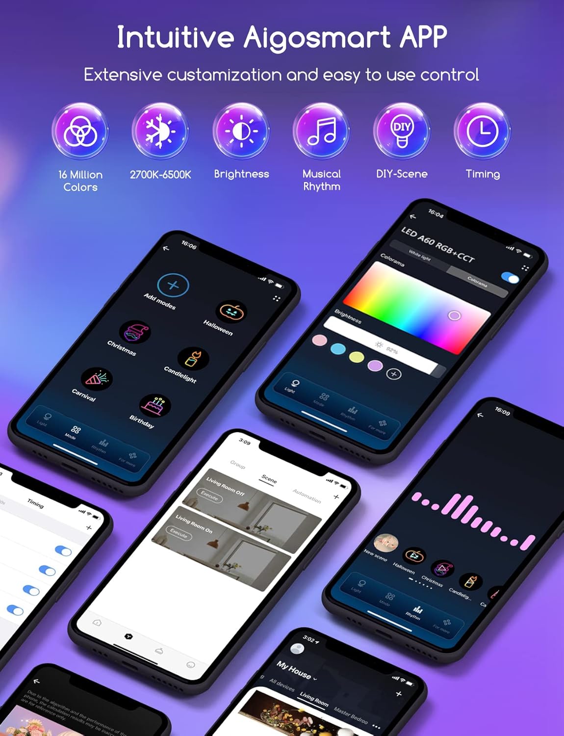[App en spraakbediening]: geen hub of smart plug nodig. Download gewoon de gratis Aigosmart-app, verbind deze slimme gloeilamp met je 2,4 GHz wifi en je kunt je wifi-gloeilamp overal bedienen. Bovendien is deze wifi-lamp compatibel met Alexa en Google Assistant voor spraakbediening, waardoor je je handen vrij hebt en oneindig veel mogelijkheden hebt. (Opmerking: niet compatibel met 5 GHz WLAN).