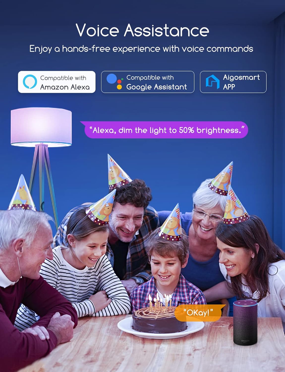 • Spraak- en afstandsbediening: 6,5 W WiFi Smart LED Bulb werkt met elke wifi-router, geen hub of smart plug nodig, eenvoudig te installeren. Download gewoon de gratis Aigosmart app, verbind je Alexa-gloeilampen met je 2,4 GHz wifi en je kunt je gloeilampen overal bedienen. Bovendien is deze wifi-lamp compatibel met Alexa en Google Assistant voor spraakbesturing. (Opmerking: 5 GHz wifi wordt niet ondersteund.)