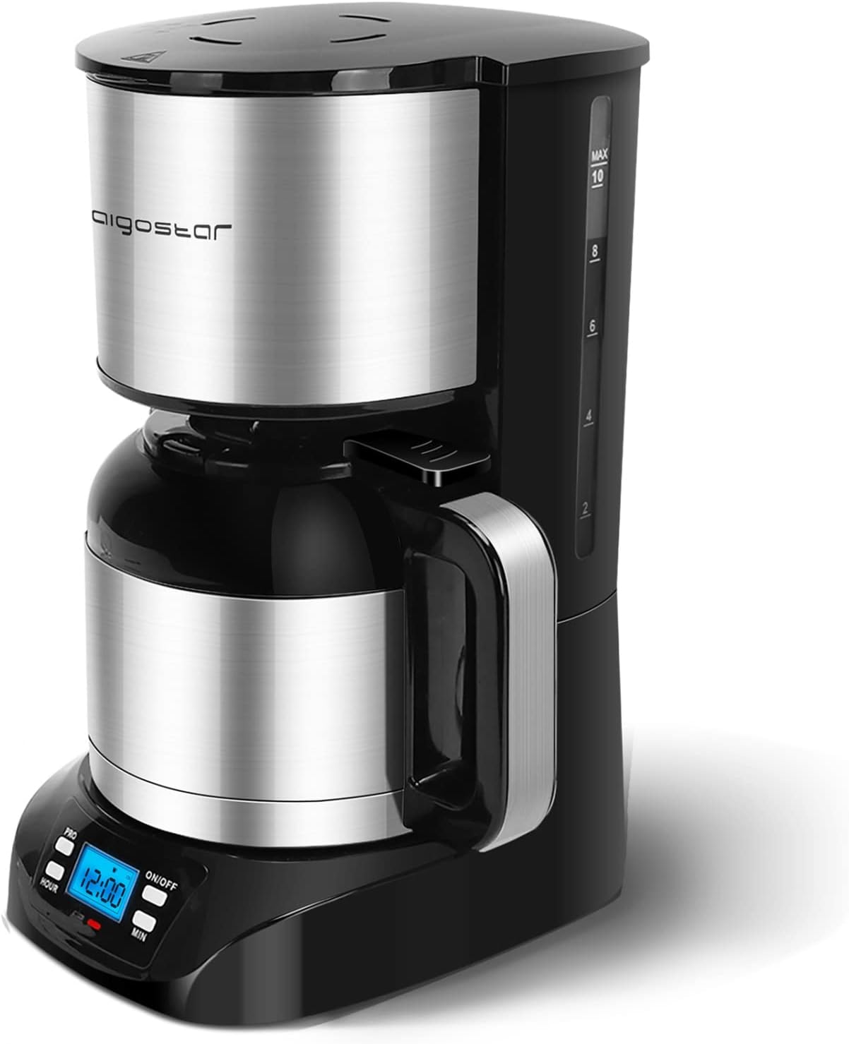 Tijdloos design: het klassieke ontwerp van het druppelkoffiezetapparaat combineert roestvrij staal en technologie met zijn LCD-display, waarmee u de starttijd tot 24 uur van tevoren kunt programmeren. Geniet altijd van verse koffie.