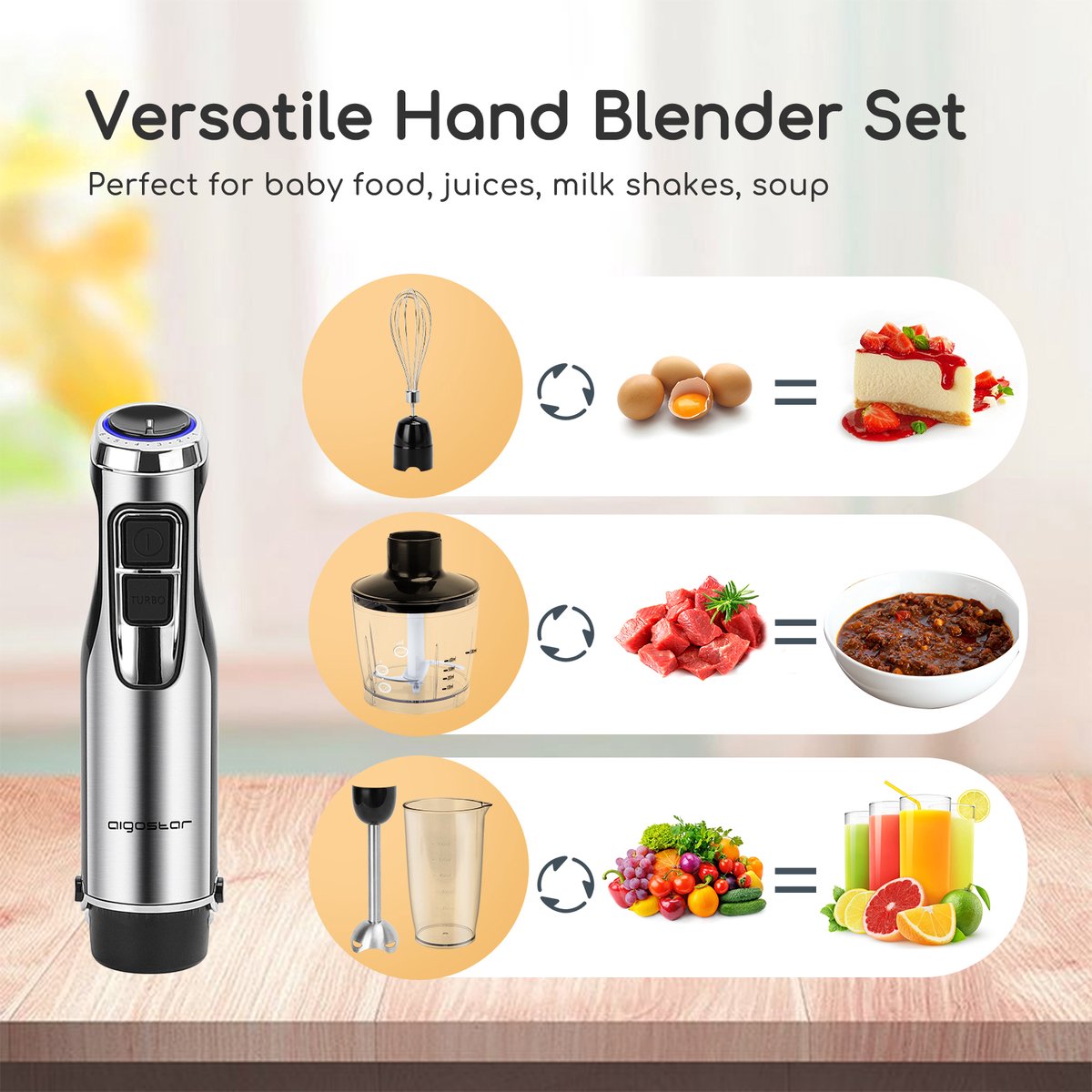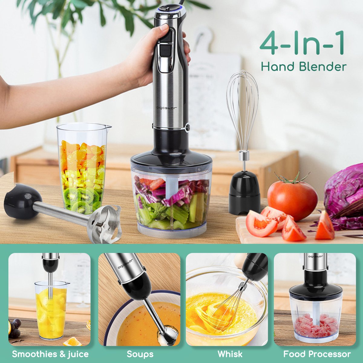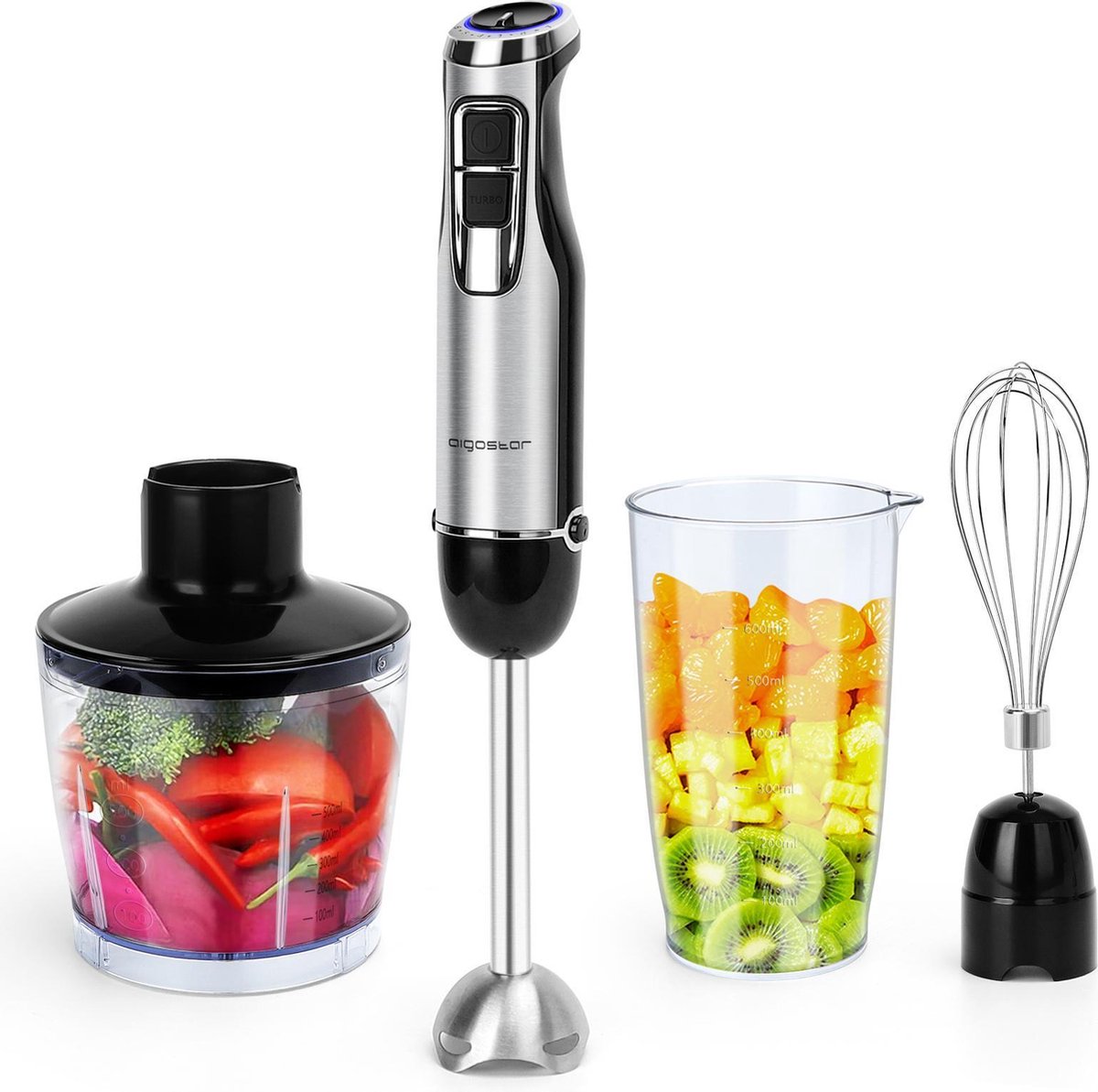 Deze ergonomische Aigostar Buckle Staafmixer set is een handig hulpje in iedere keuken. Deze multifunctionele set om te vermalen heeft verschillende opzetstukken en functies, waardoor je zult zien dat deze set onmisbaar is in jouw keuken. De handgreep kan van de mixer worden verwijderd, zodat je eventuele voedselresten makkelijker kan schoonmaken.