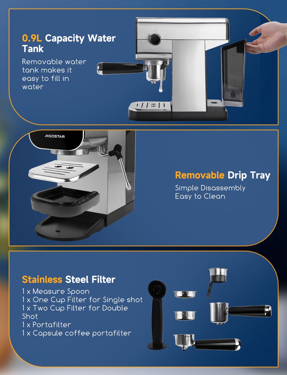 - De verwijderbare onderdelen maken dit espressoapparaat eenvoudig te gebruiken en schoon te maken.