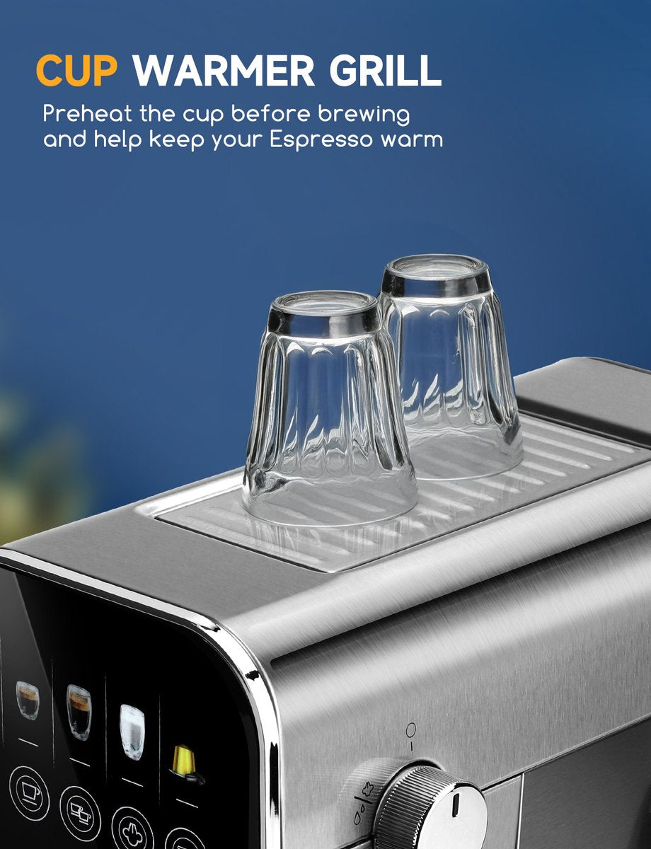 De espressomachine past uw koffie-ervaring eenvoudig aan met LCD-aanraakbediening, waarmee u het koffievolume, de stoom- en heetwaterfuncties kunt aanpassen, waardoor het zetten efficiënt en intuïtief wordt.