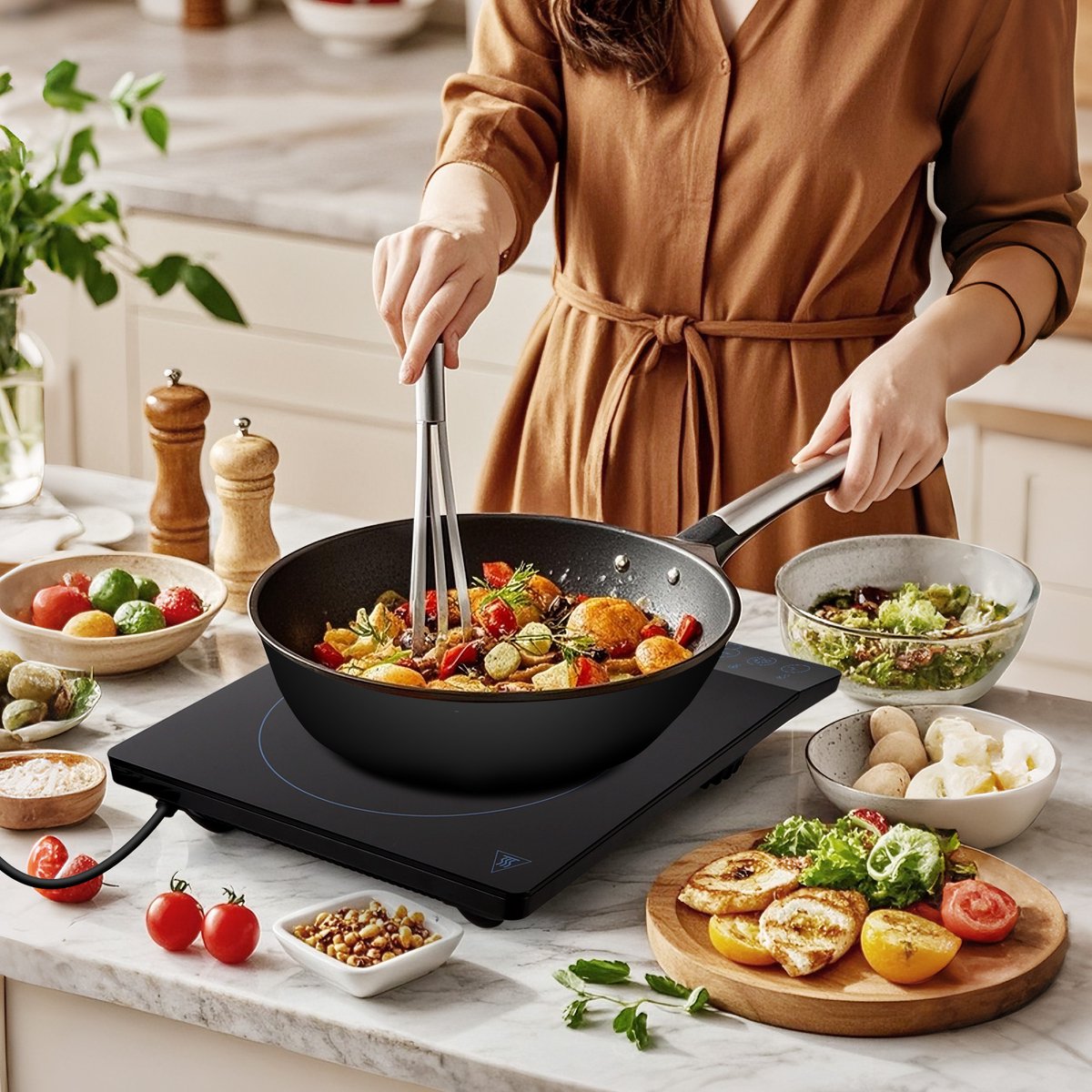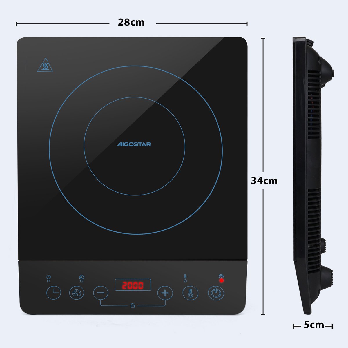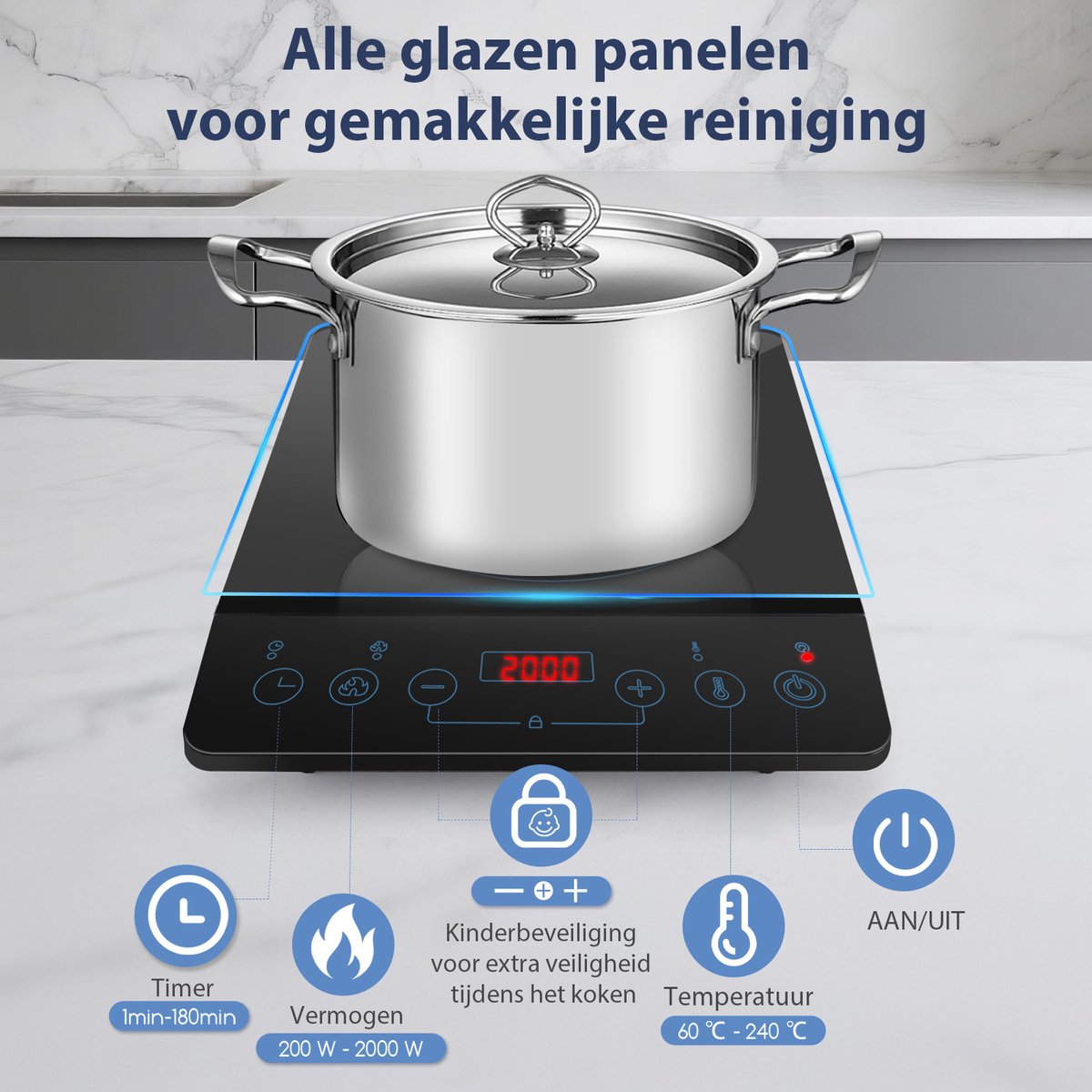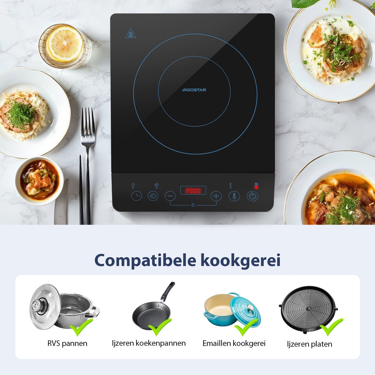 2000 watt vermogen: Dankzij het hoge vermogen warmt de inductiekookplaat razendsnel op – sneller dan gasfornuizen of traditionele elektrische pannen. Dit bespaart niet alleen tijd, maar ook energie.