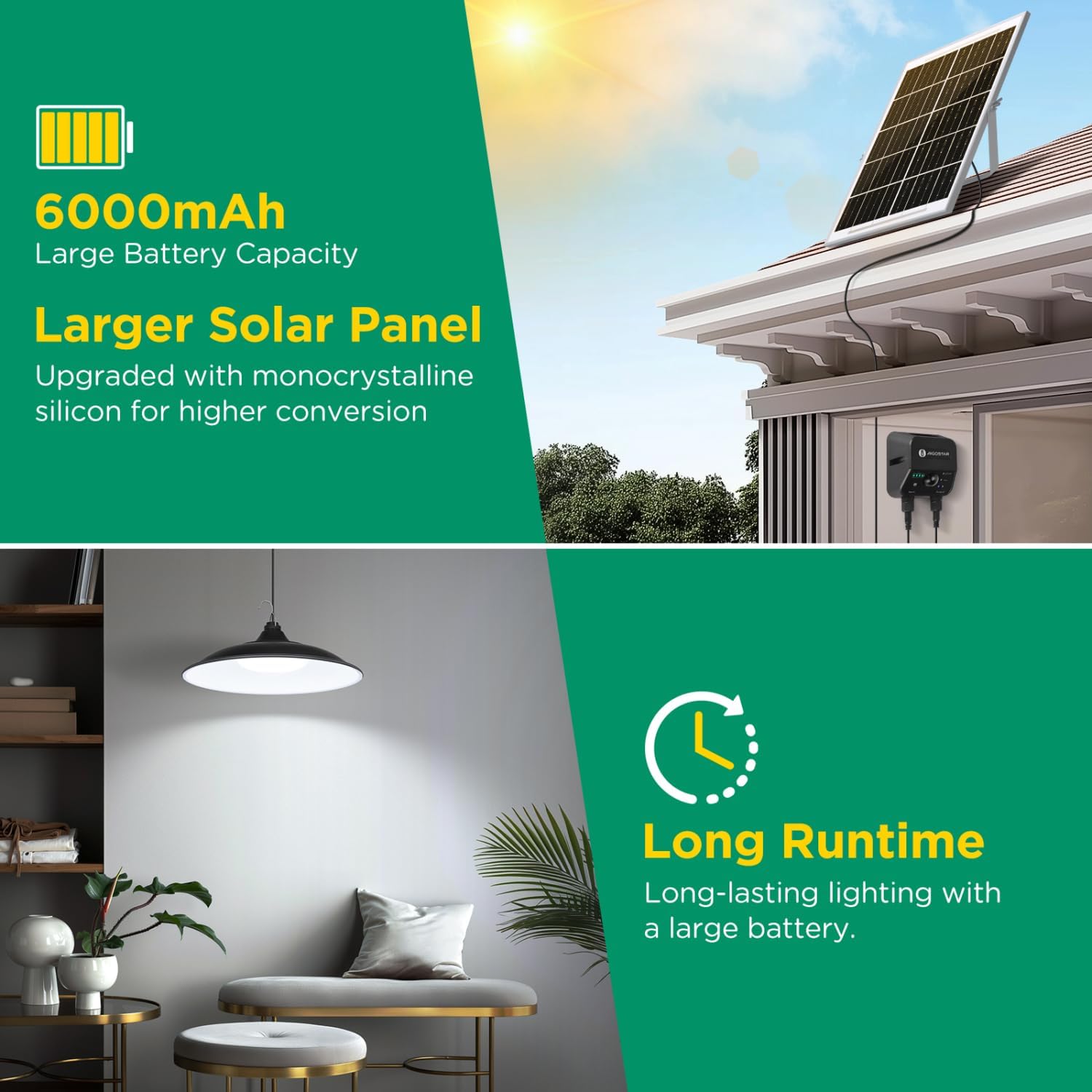 Grote batterijcapaciteit en lange gebruiksduur: de Aigostar hanglamp op zonne-energie maakt gebruik van grotere zonnepanelen en een grotere accucapaciteit. Het zonnepaneel meet 270 × 180 mm; de accucapaciteit bedraagt 6000 mAh, en na volledig opladen kan de hanglamp op zonne-energie 8 uur ononderbroken werken – zonder extra stroomkosten.