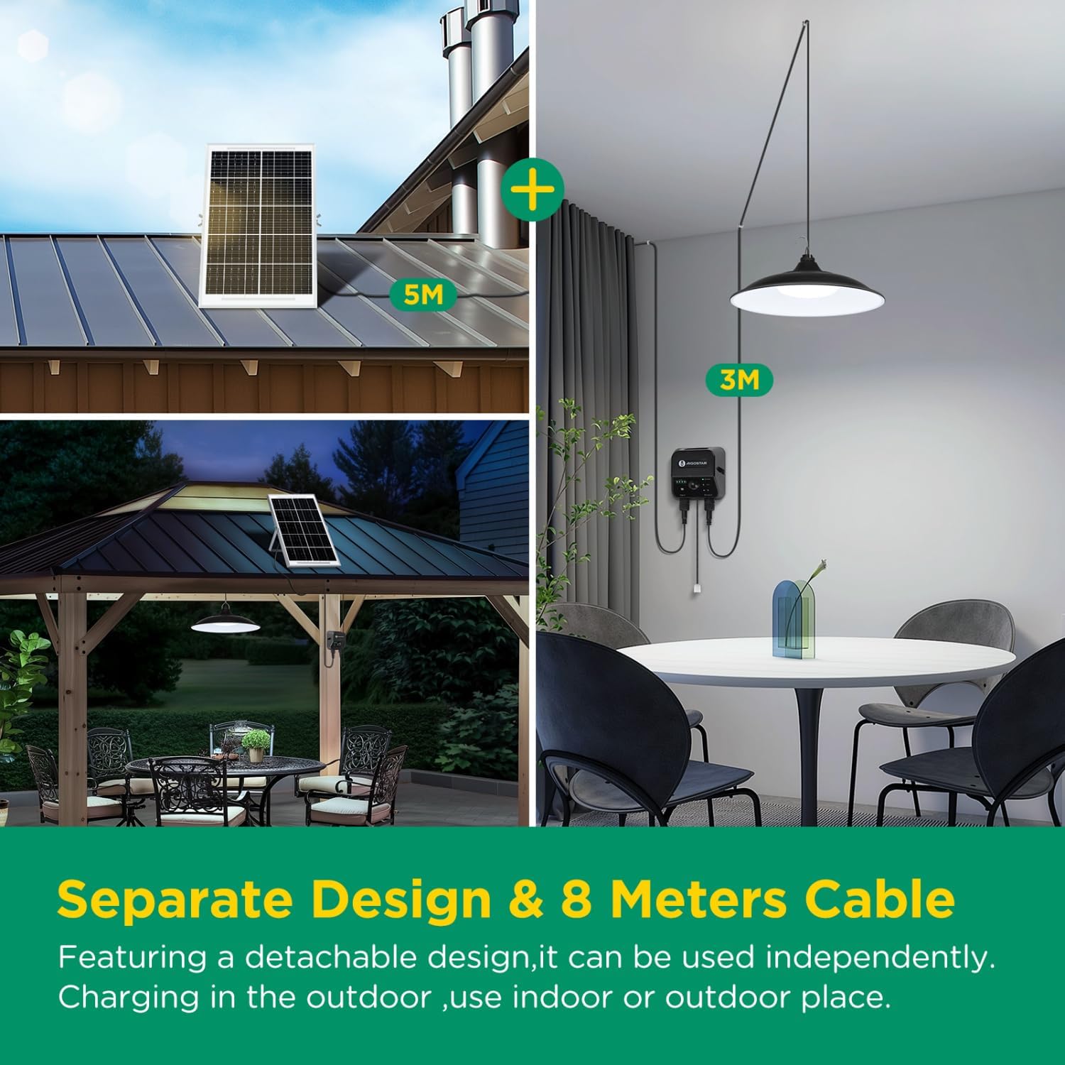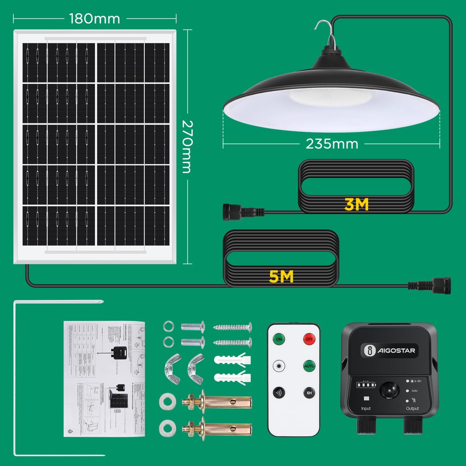 【Solarlampen met 8 meter kabel】De Aigostar solarlamp heeft een 8 meter lange kabel (zonnepaneelkabel: 5 m/lampkabel: 3 m), die een flexibele installatie mogelijk maakt en verschillende binnen- en buitentoepassingen dekt. De lampenkap heeft een diameter van 235 mm. Met haken voor het ophangen in tuinen, binnenplaatsen, op balkons, veranda's, camping, tenten enz.