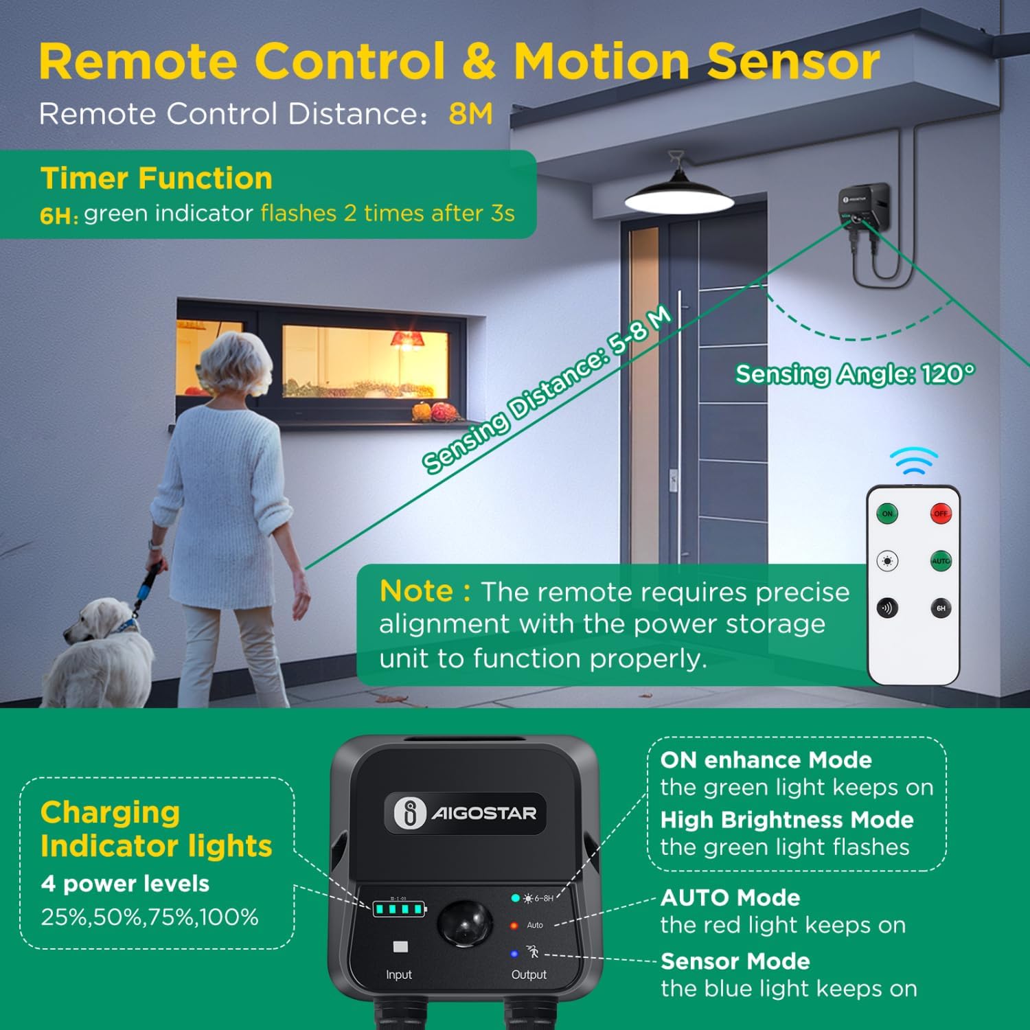 Afstandsbediening en 2 bedrijfsmodi: de afstandsbediening heeft een bereik van maximaal 8 m. Met de afstandsbediening kun je de helderheid aanpassen, de verlichtingsduur instellen en de bedrijfsmodus kiezen. De hanglamp heeft een detectiebereik van 5-8 m. In detectiemodus: de lamp brandt wanneer een persoon wordt gedetecteerd en schakelt uit als er niemand meer aanwezig is. In de "auto"-modus: overdag laadt automatisch het zonnepaneel op. uit, 's nachts schakelt de lamp automatisch aan.