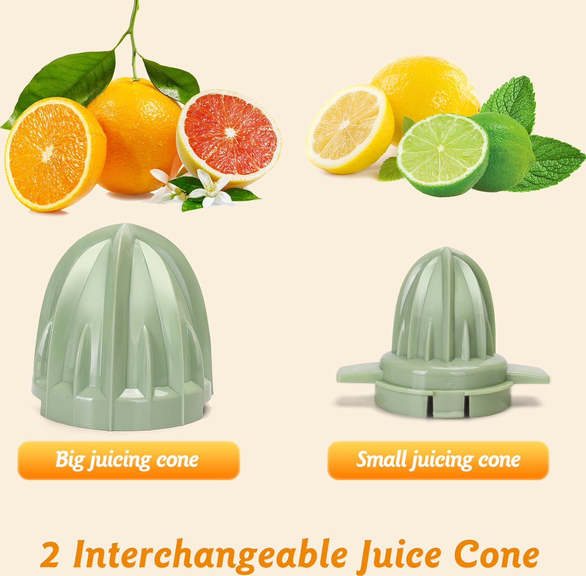 Deze citruspers bevat 2 citruskegels, geschikt voor citrusvruchten van verschillende groottes. De grote kegel is voor grotere vruchten zoals sinaasappels en grapefruits, en de kleine kegel is voor kleinere vruchten zoals citroen en limoenen. Onze sapmachines behouden 100% van de vitamines, enzymen en andere voedingsstoffen in het sap. Ideaal voor het maken van vers sap!