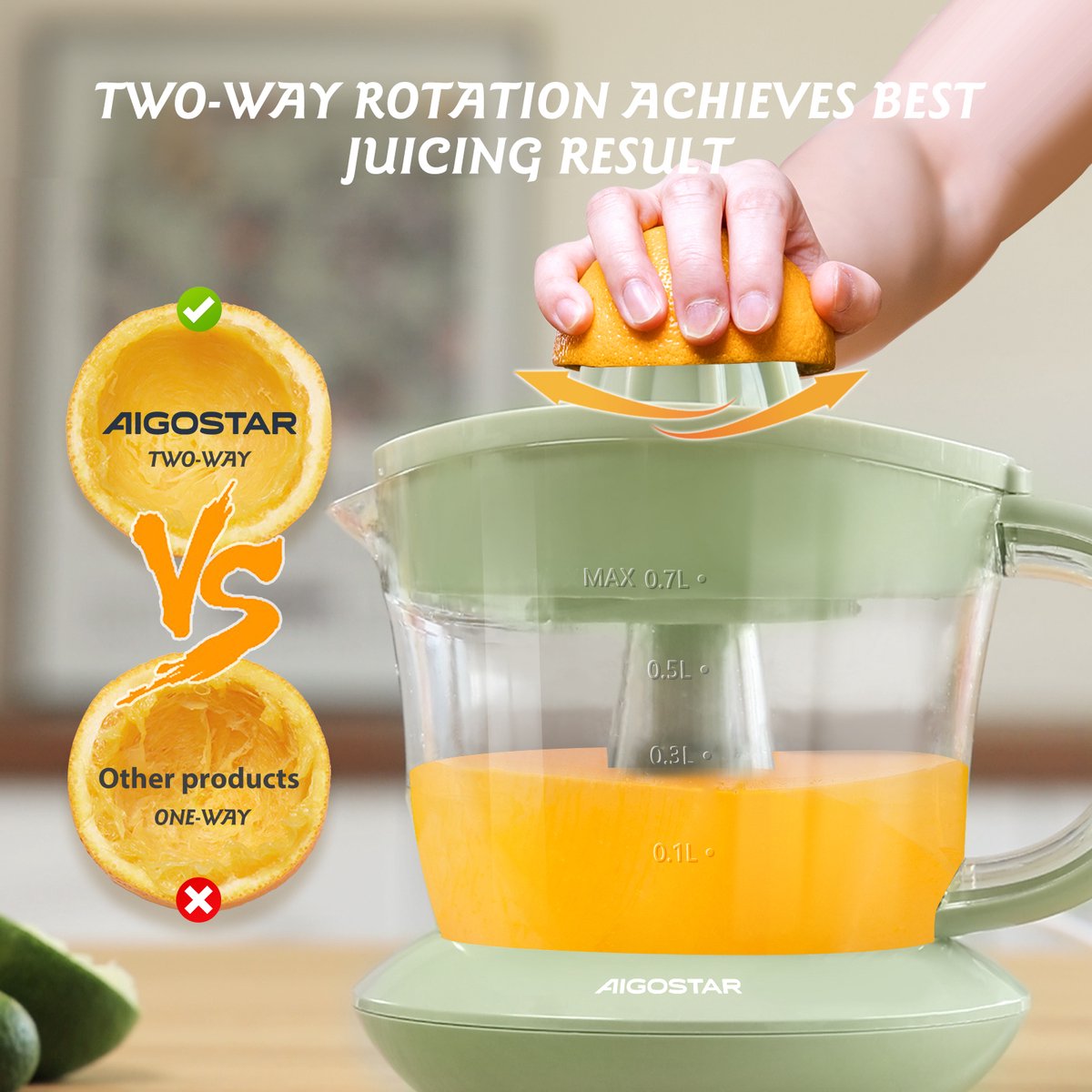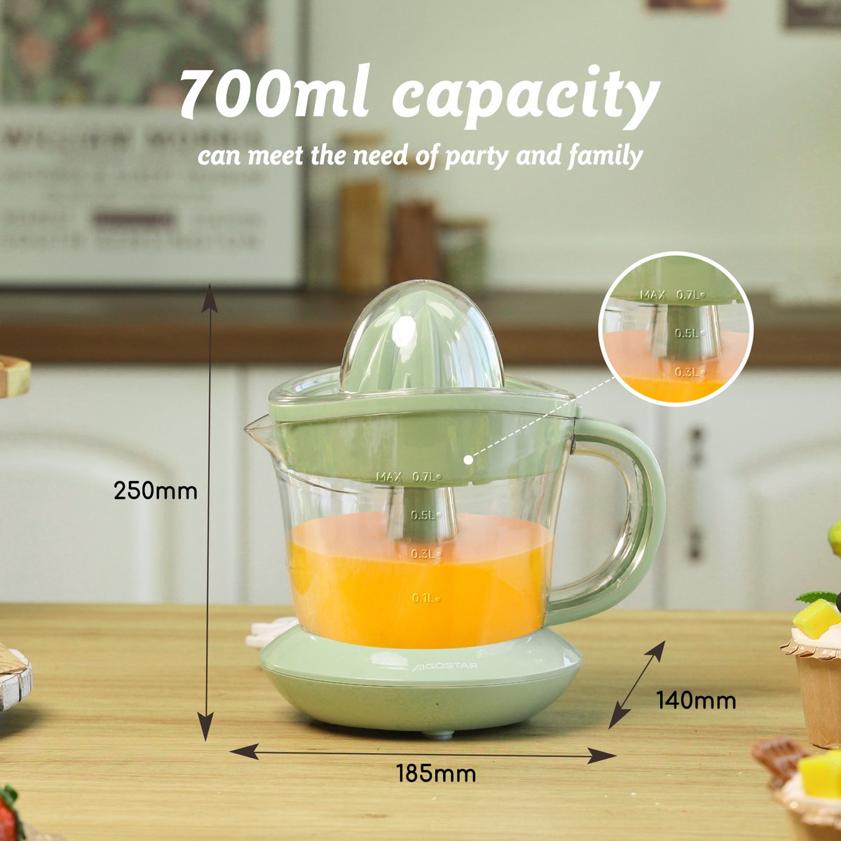 Volwassenen hebben tussen de 75 en 102 mg vitamine C per dag nodig. Het drinken van een glas na de lunch kan de vetopname verminderen, de spijsvertering verbeteren en dorstgevoelens wegnemen. Haal het meeste uit je citrusvruchten met onze veelzijdige Aigostar citruspers en geniet met gemak van vers sap! De opvangbak heeft een capaciteit van 0,7 liter, dus je kunt genoeg sap persen voor 3-4 kopjes of het sap bewaren in de koelkast. Draai de perskegel naar links en rechts om een zeer grote hoeveelheid sap te krijgen!