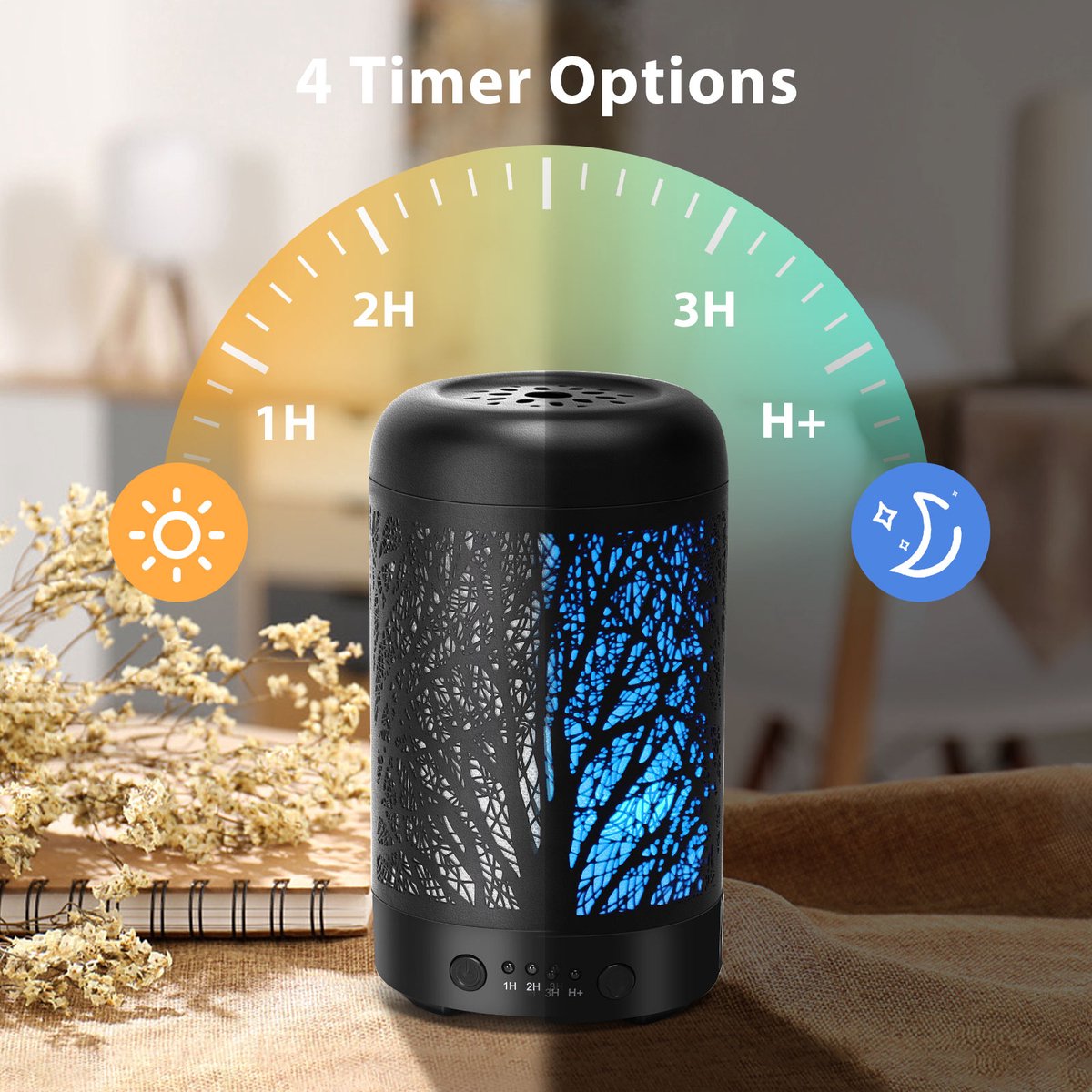 U hoeft zich geen zorgen te maken over het uitschakelen van de aromadiffuser. De ingebouwde slimme sensor schakelt het apparaat automatisch uit wanneer de watertank leeg is. Bovendien heeft de diffuser een timerinstelling waarmee u 1, 2, 3 of meer uur kunt kiezen om frisse lucht in de omgeving te verspreiden. Zolang de aromadiffuser voldoende is gevuld, kan het doorgaan met het verspreiden van deze lucht.