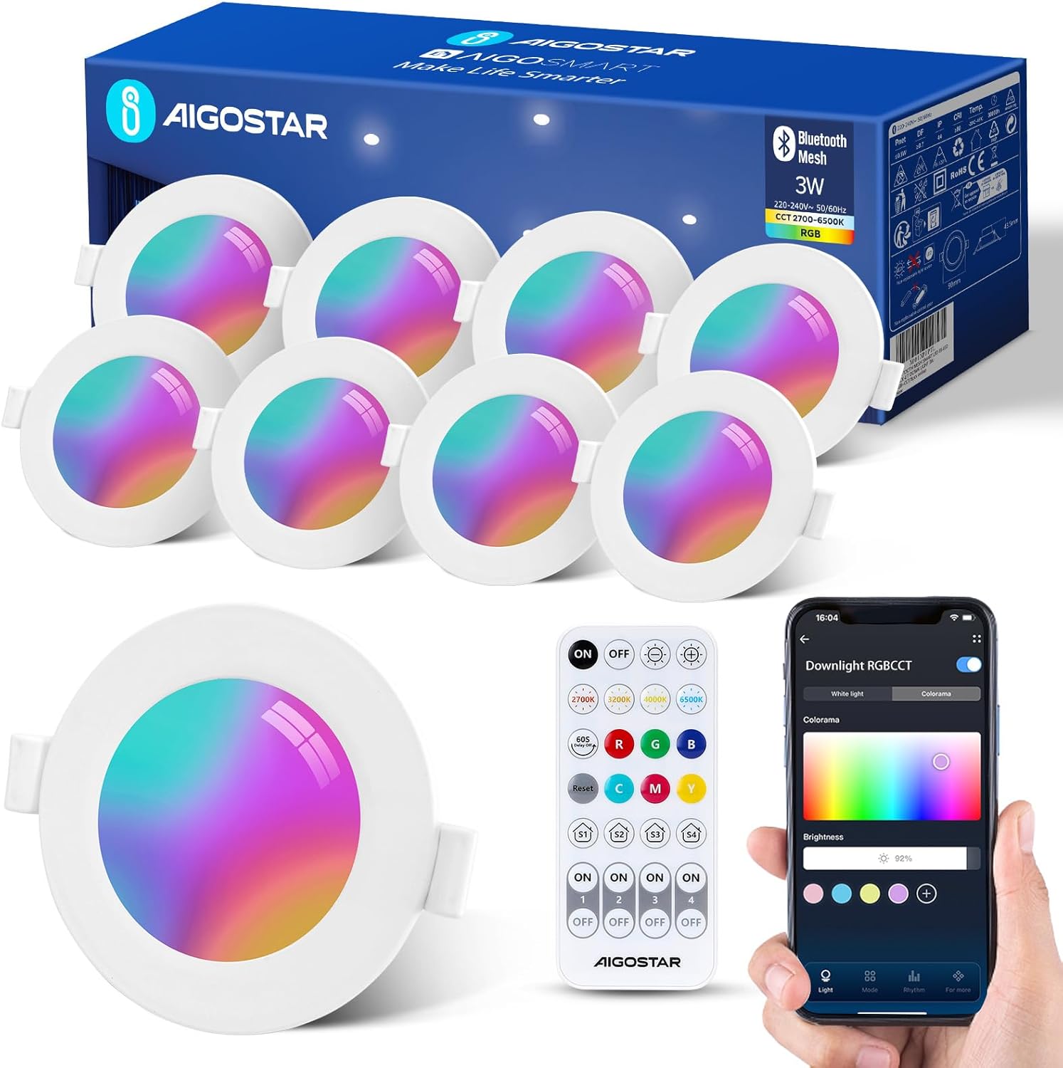 16 miljoen DIY-kleuren: de Alexa-compatibele dimbare RGB-inbouwlampen hebben tot 16 miljoen kleuren en ondersteunen de omzetting van warm wit en koud wit licht van 2700 K tot 6500 K, ideaal voor verschillende scenario's zoals ontspannen, werken, entertainment. Helderheid vanaf 1%. Tot 100% is instelbaar, pas altijd je favoriete helderheid en kleur aan en geniet van de gepersonaliseerde lichtervaring die Aigostar led-downlights je bieden.