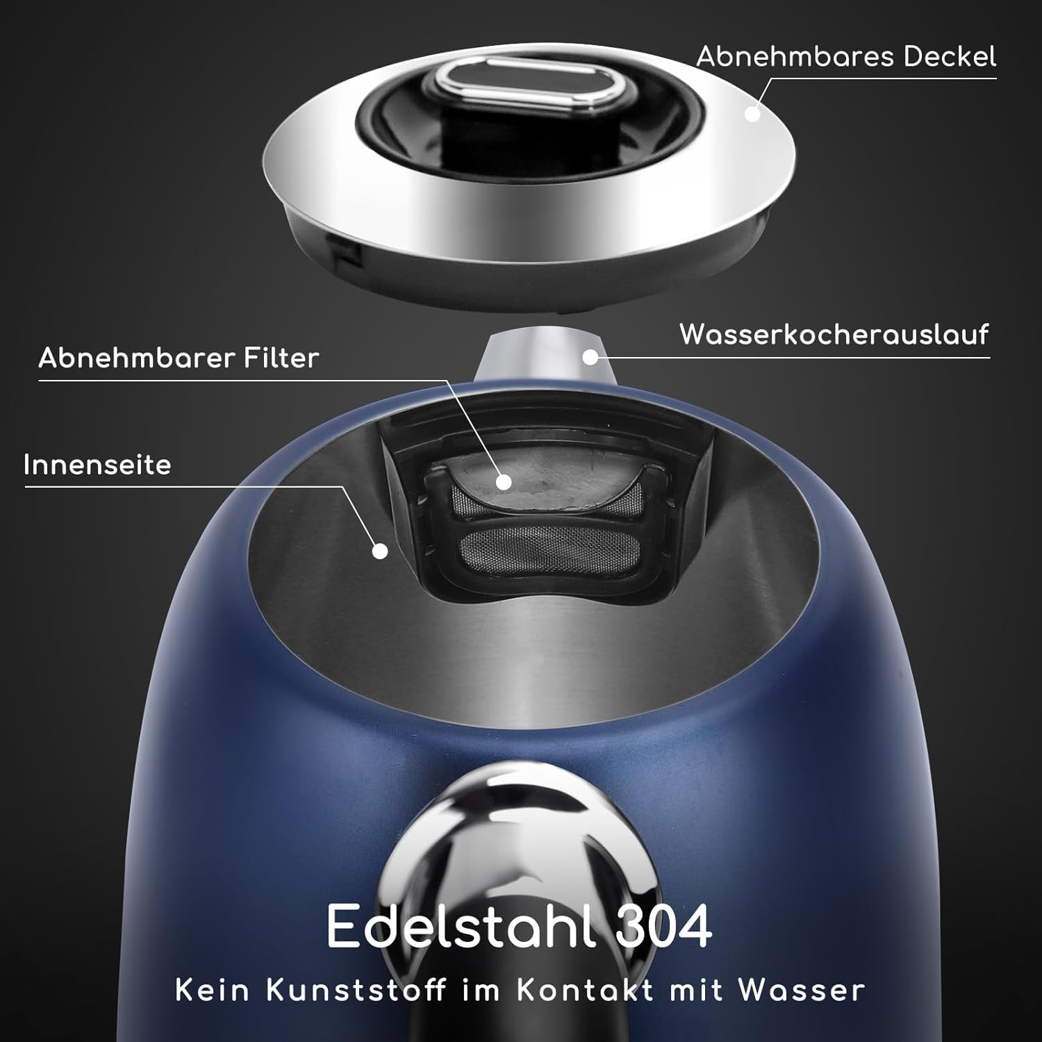 Waterkoker zonder plastic: de binnenkant van de waterkoker bestaat volledig uit voedselveilig roestvrij staal 304, zonder contact met kunststof, voor zuiver water. Het afneembare deksel maakt een grondige reiniging mogelijk; het uitgebalanceerde schenkontwerp zorgt voor soepel uitgieten zonder morsen.
