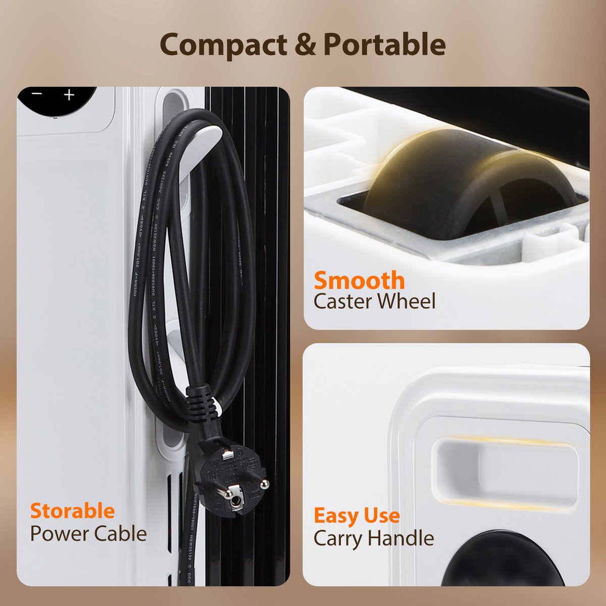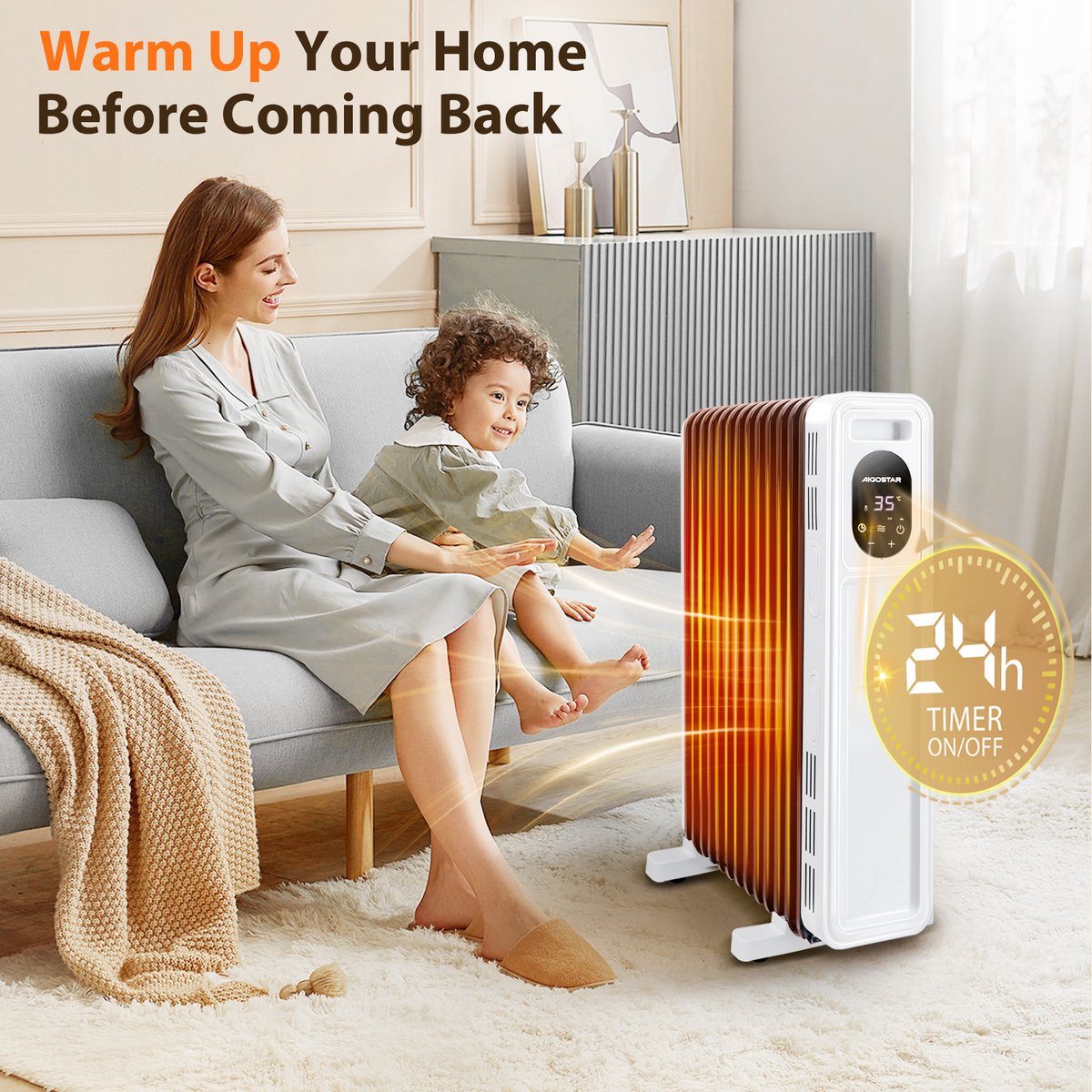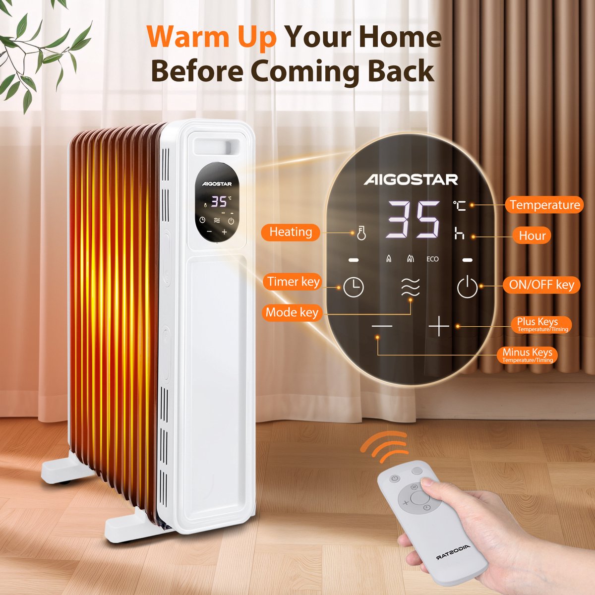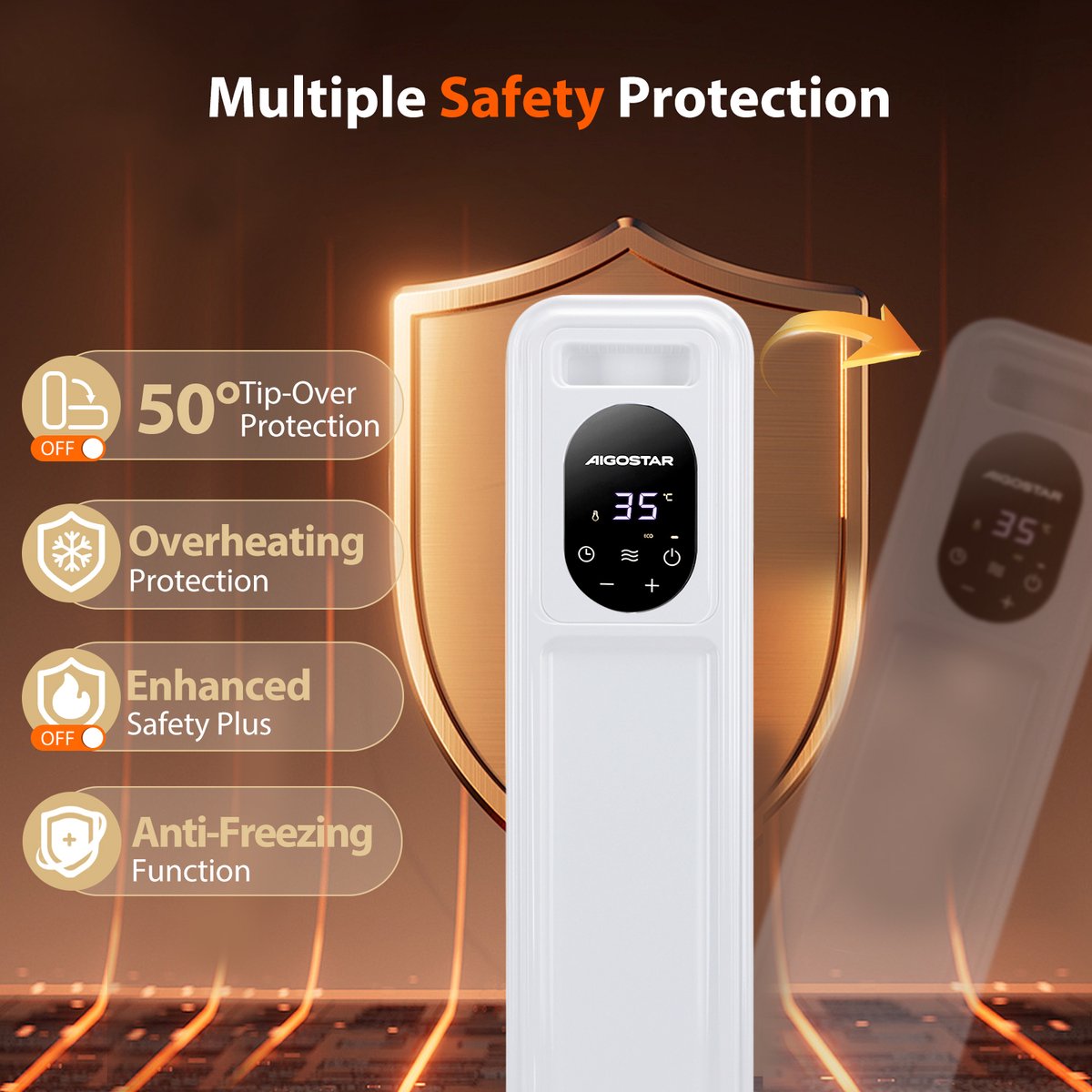 De Aiogstar radiator kan snel opwarmen met een vermogen van 2500 watt, wat de efficiëntie met 92,3% verhoogt. De 13 verbeterde en verdikte warmteafvoervinnen kunnen de warmte stiller en gelijkmatiger door het hele huis verdelen. Snelle, stille en gelijkmatige verwarming zorgt ervoor dat u zich comfortabel voelt. De radiator heeft een handvat en vier wielen, zodat u hem gemakkelijk naar elke kamer kunt verplaatsen. Bovendien is er een opbergontwerp voor het netsnoer aan de zijkant voor eenvoudige opslag.