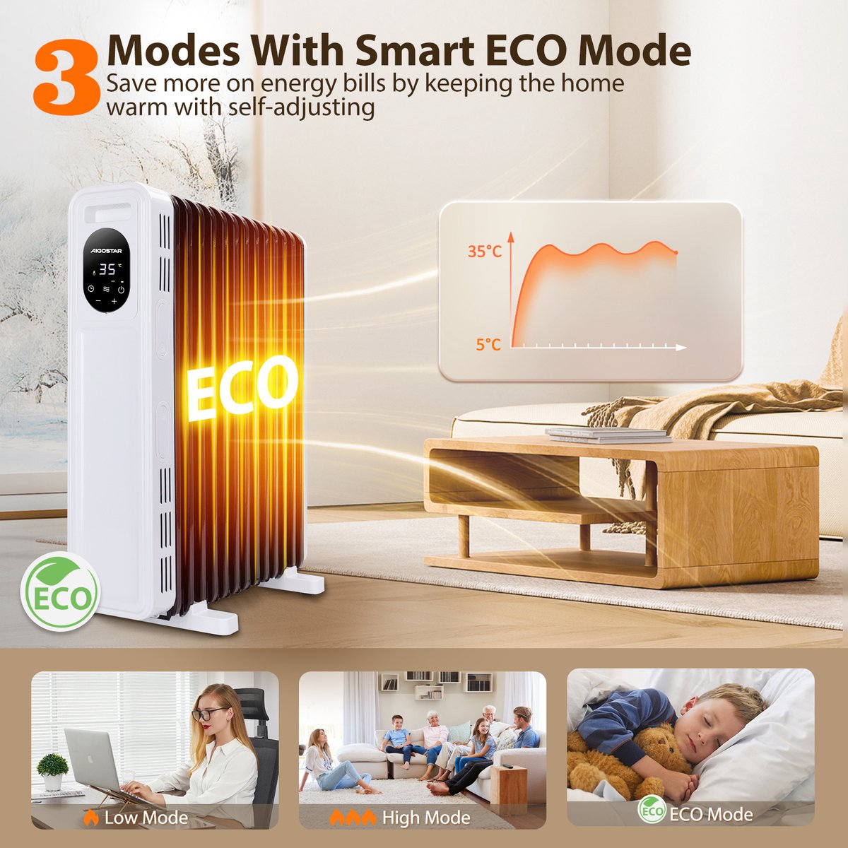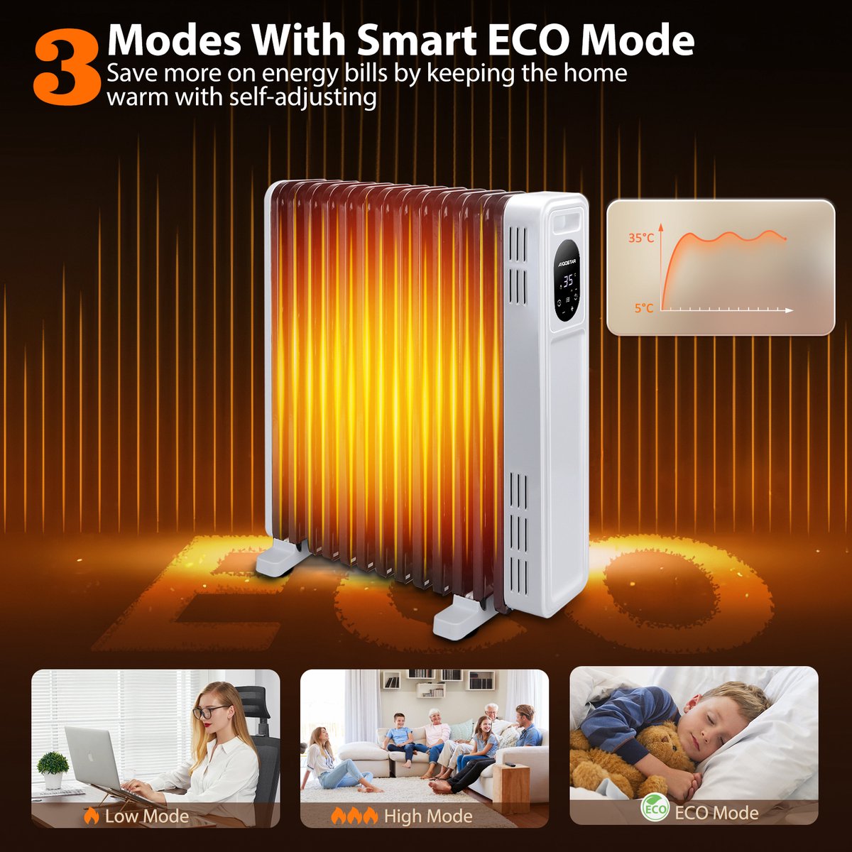 De radiator heeft drie standen (Laag: 1000W, Hoog: 2500W, ECO: 2500W) en u kunt een temperatuur van 5-35℃ kiezen op basis van uw behoeften, wat zeer geschikt is voor het verwarmen van een kamer van 25㎡. De ECO-modus kan het energieverbruik in realtime optimaliseren, waardoor rekeningen en middelen worden bespaard.