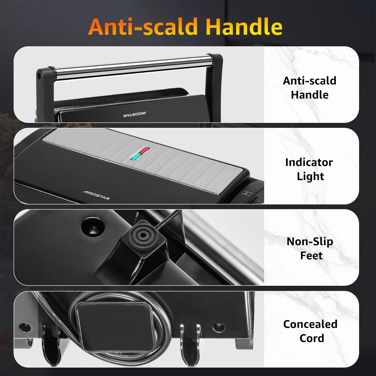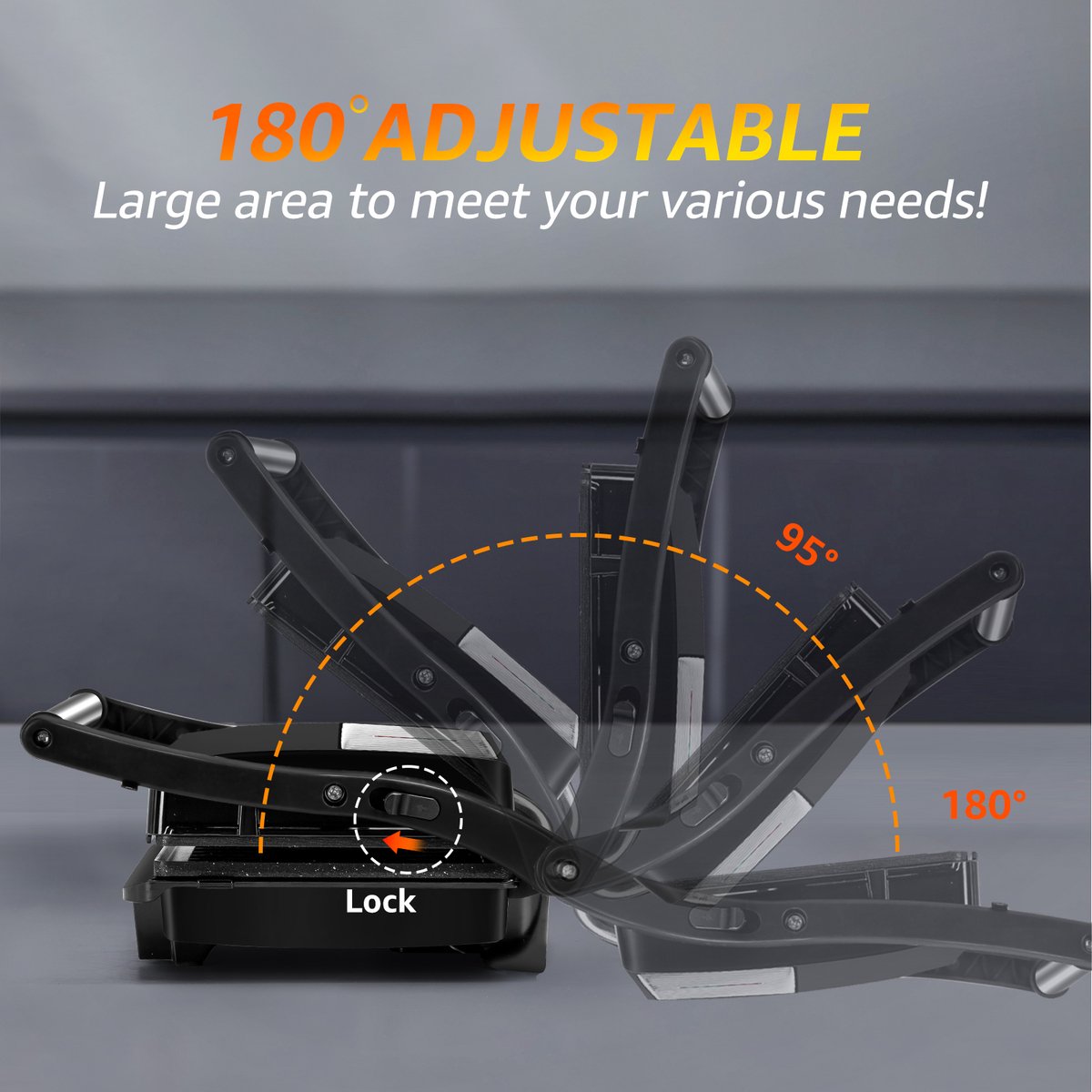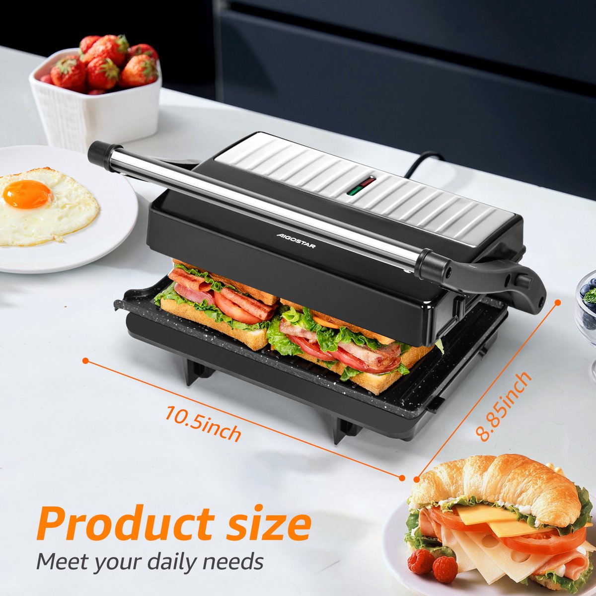 Aigostar York Pro kan worden gebruikt als elektrische grill voor steaks, vis, groenten en meer, maar ook als panini-pers, sandwichmaker of broodrooster voor meerdere lagen sandwiches, omdat het alle soorten broodmaten en -diktes ondersteunt. Verstelbare scharnieren, beweging. De grill is perfect voor het gemakkelijk en snel bereiden van verschillende soorten maaltijden, diners of ontbijt, zonder pannen of kookgerei vuil te maken.