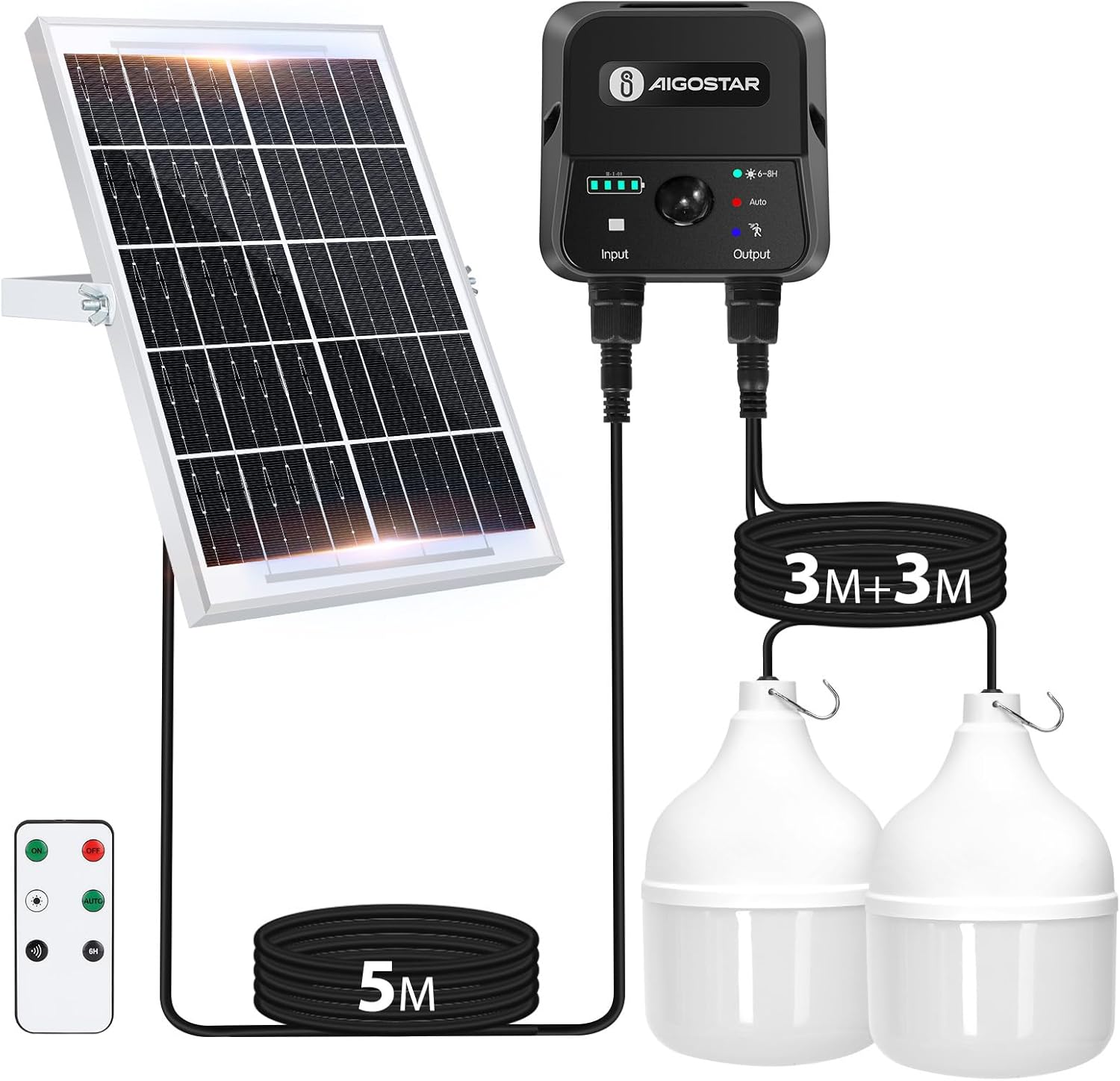 Hoge helderheid: de Aigostar hanglamp op zonne-energie beschikt over een vermogen van 70 W, een helderheid van 700 lm en biedt een koud wit licht van 6500 K met een stralingshoek van 120°. Hij bevat 11 meter kabel (5 meter voor de zonnepaneelkabel en 3 + 3 meter voor de lichtkabel). De gloeilampen beschikken over geïntegreerde haken voor een flexibele installatie en zijn daardoor een veelzijdige oplossing voor de meeste binnen- en buitenverlichtingsscenario's