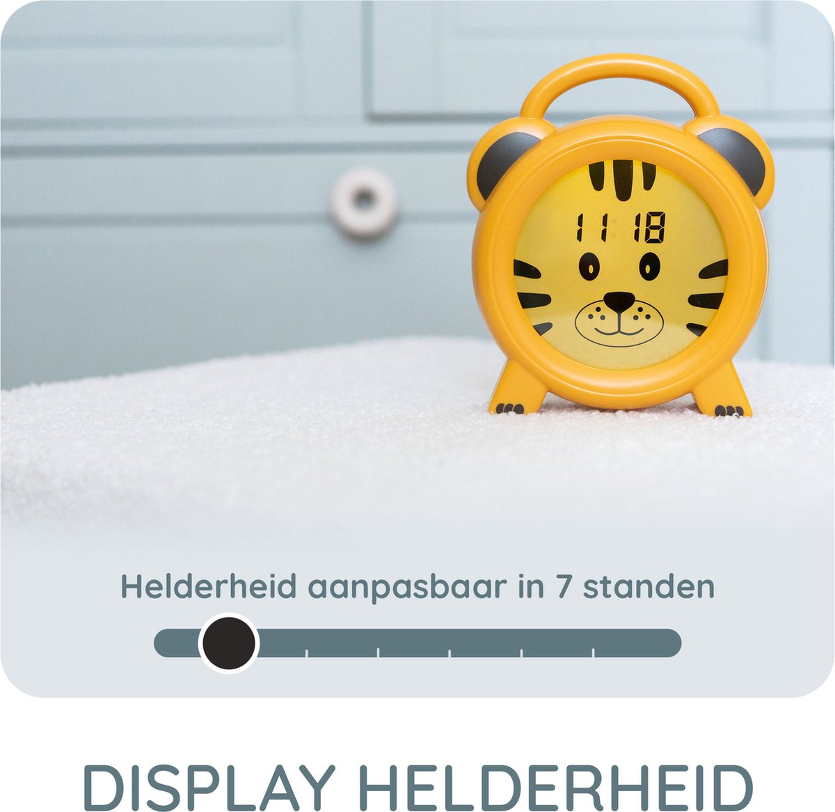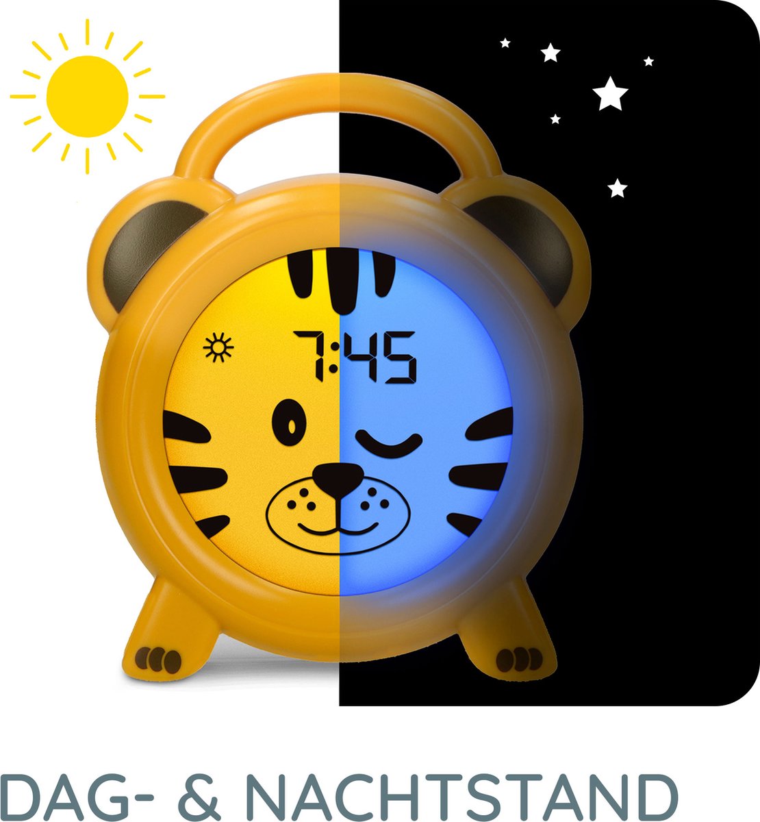 Deze handige nachtlampwekker werkt op een inventieve manier. Hij laat je kind automatisch wennen aan het moment om te slapen en ook wanneer je kind mag opstaan. Als ouder stel je eenmalig de slaaptijd en de wektijd in. Bij slaaptijd kleurt het display blauw en het tijger doet zijn ogen dicht. Vanaf de wektijd kleurt het display oranje en opent het tijger zijn ogen. Je kind weet meteen wanneer het tijd is om te slapen, of tijd is om op te staan door middel van de kleuren op de klok. Ook wanneer je kindje een keertje te vroeg wakker wordt, weet het dat het nog even in bed moet blijven liggen. Dit komt natuurlijk de nachtrust van papa en mama zeer ten goede!