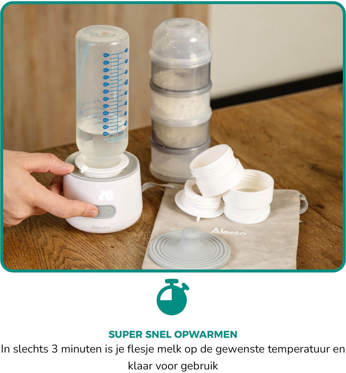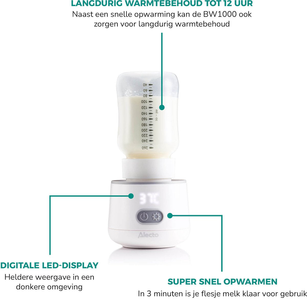Met de BW1000 hoef je nooit meer lang te wachten op een warme fles. Binnen slechts 3 minuten is de melk op de gewenste temperatuur en klaar voor gebruik. Met de 4 instelbare temperatuurniveaus (37°C, 40°C, 45°C en 50°C) bepaal je zelf welke temperatuur het beste past bij de voeding van je kindje. De geavanceerde verwarmingsfunctie zorgt voor een gelijkmatige temperatuurverdeling, zodat je altijd verzekerd bent van een perfect verwarmde fles.