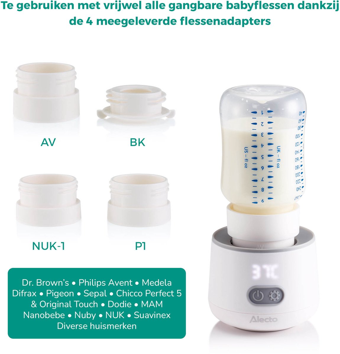 Geen gedoe met flessen die niet passen: dankzij de vier meegeleverde flessenadapters is de Alecto BW1000 geschikt voor vrijwel alle gangbare babyflessen. Of je nu gebruikmaakt van Philips Avent, Dr. Brown's, Difrax of een ander merk, met deze flessenadapters past jouw flesje altijd op de flessenwarmer. Twijfel je of jouw babyfles geschikt is voor onze flessenwarmer? Bekijk dan onderaan de productbeschrijving de handige lijst met compatibele flessen!