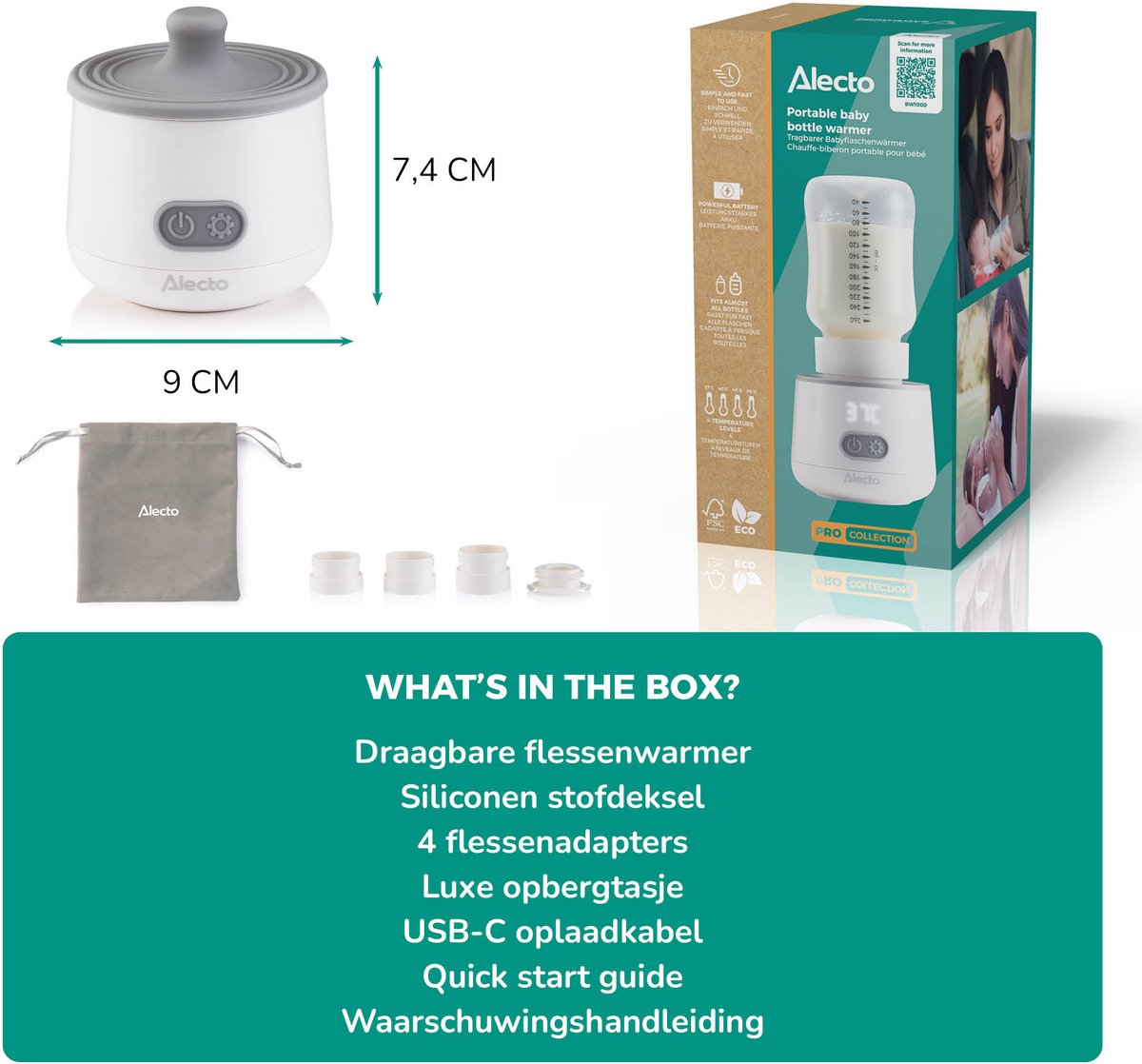 Met de Alecto BW1000 uit Alecto's PRO-collectie haal je een compacte, draadloze en draagbare flessenwarmer in huis, perfect voor ouders die onderweg altijd voorbereid willen zijn. Deze krachtige flessenwarmer biedt ultiem gebruiksgemak dankzij de snelle opwarmtijd, lange batterijduur en universele compatibiliteit. Of je nu een dagje weg bent of op reis, met de BW1000 kun je waar je maar wilt flesvoeding voor je kindje bereiden. De vier meegeleverde adapters zorgen ervoor dat de flessenwarmer geschikt is voor nagenoeg alle babyflessen. Het luxe en compacte design, gecombineerd met slimme technologieën zoals het digitale LED-display en de keuze uit vier temperatuurniveaus, maken dit een onmisbaar hulpmiddel voor ouders. De flessenwarmer voor onderweg wordt onder andere geleverd met een siliconen stofdeksel en een luxe fluwelen opbergtasje. Kies voor de Alecto BW1000 en ervaar het gemak van altijd en overal een perfect verwarmd flesje voor je baby!