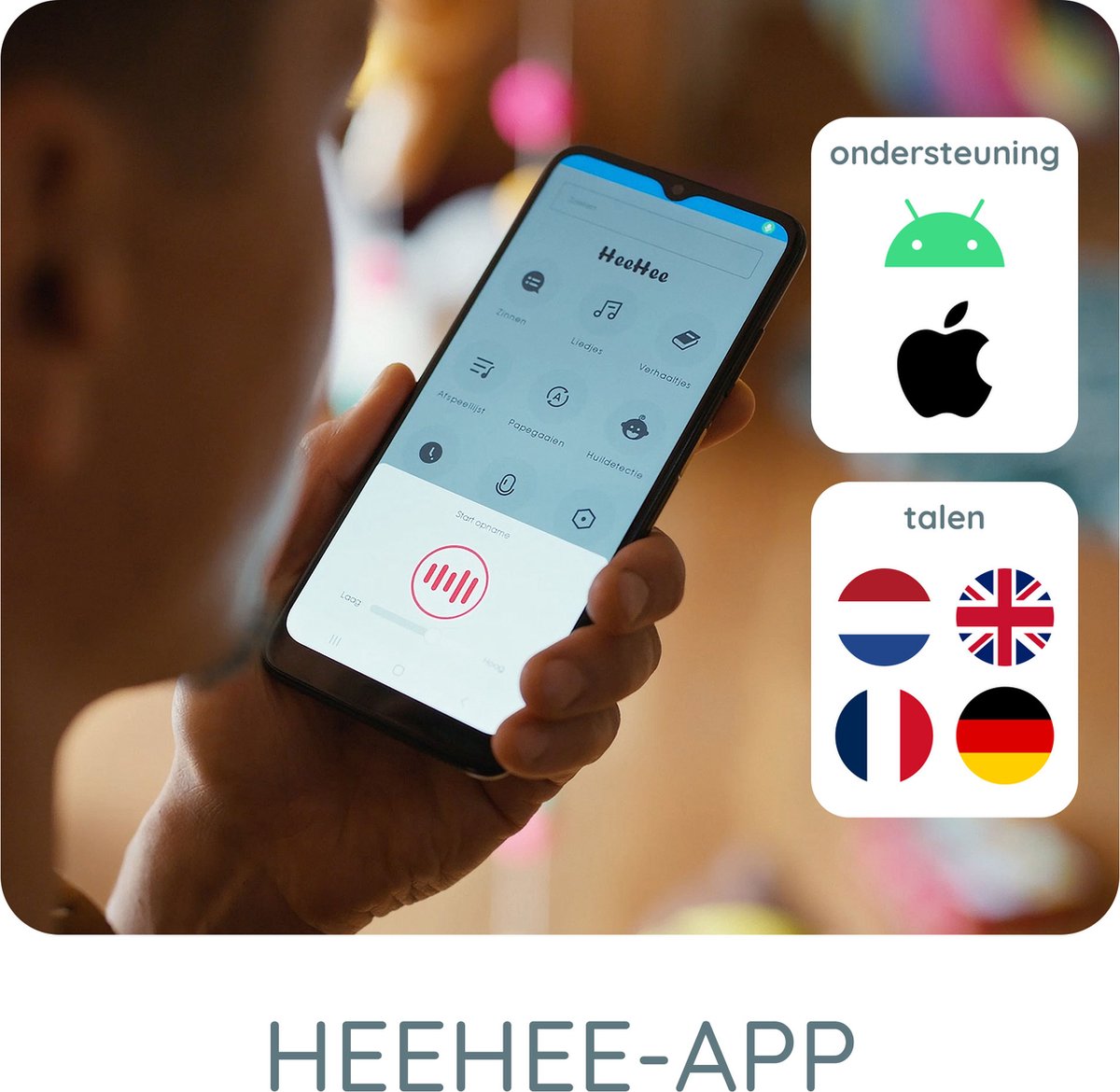 Deze functie zet tekstberichten om in spraak. Kies een van de voorgeprogrammeerde tekstberichten of maak je eigen bericht in de app. Druk op versturen en de knuffel/HeeHee spreekt de woorden/zinnen op natuurlijke wijze in de eigen taal uit. Sla tekstberichten die je vaker gebruikt. Leuk, snel en makkelijk. Je creëert een gehele nieuwe wereld voor jou/de knuffel en je kindje.