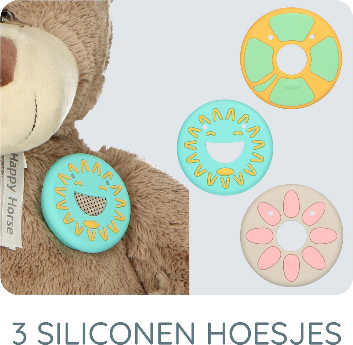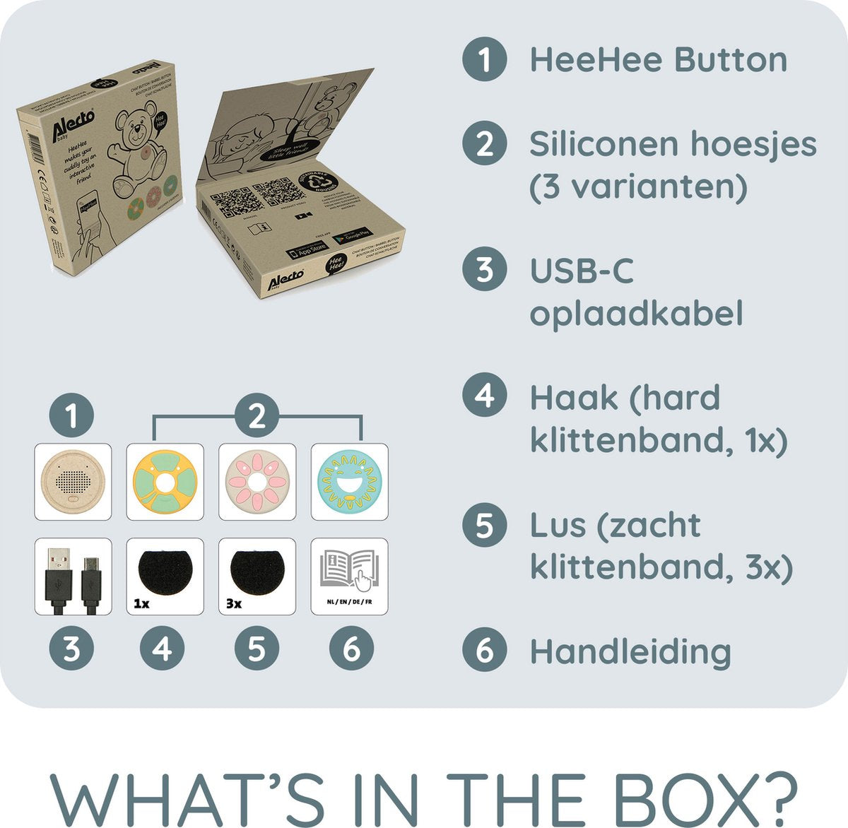 De Alecto Baby HeeHee babbel button wordt geleverd met 3 vrolijke siliconen hoesjes (klavertje vier, bloem en zonnetje), waarvan je er één over de button plaatst. Door de meegeleverde klittenbandsluiting is de button makkelijk op een knuffel te bevestigen en ook weer los te maken. Er is voldoende klittenband om de button tot op wel 3 knuffels bevestigen. Je download en installeert de gratis HeeHee app voor Android en iOS. Zorg dat Bluetooth® is ingeschakeld en maak verbinding met de knoop. Kies de gewenste taal (Nederlands, Engels, Duits, Frans, Spaans, Deens, Noors en Zweeds) en de verwondering kan beginnen.