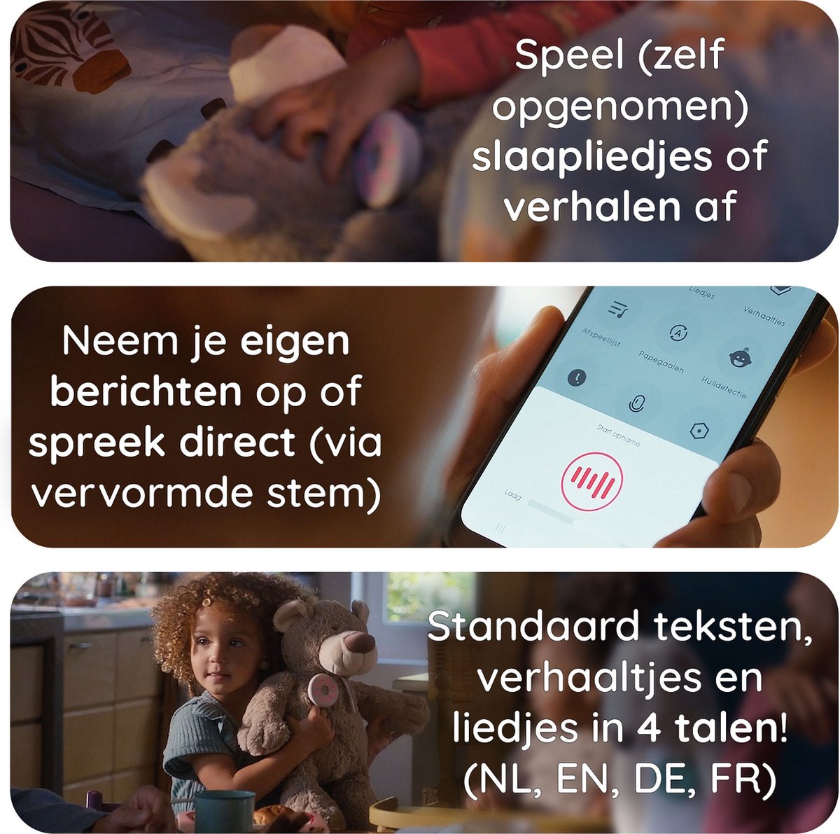 Met de stem chat praat je direct via de app met je kindje. Je bepaalt zelf de stem van de knuffel. Gewoon je eigen stem, of pas de toonhoogte aan, waardoor de stem vervormd. De knuffel krijgt een eigen stem, misschien zelfs een eigen karakter en komt zo meer tot leven.