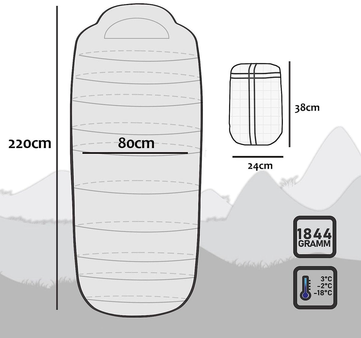 Het buitenmateriaal van de slaapzak bestaat uit waterafstotend 210T grid polyester dat bij bewegingen niet ritselt.