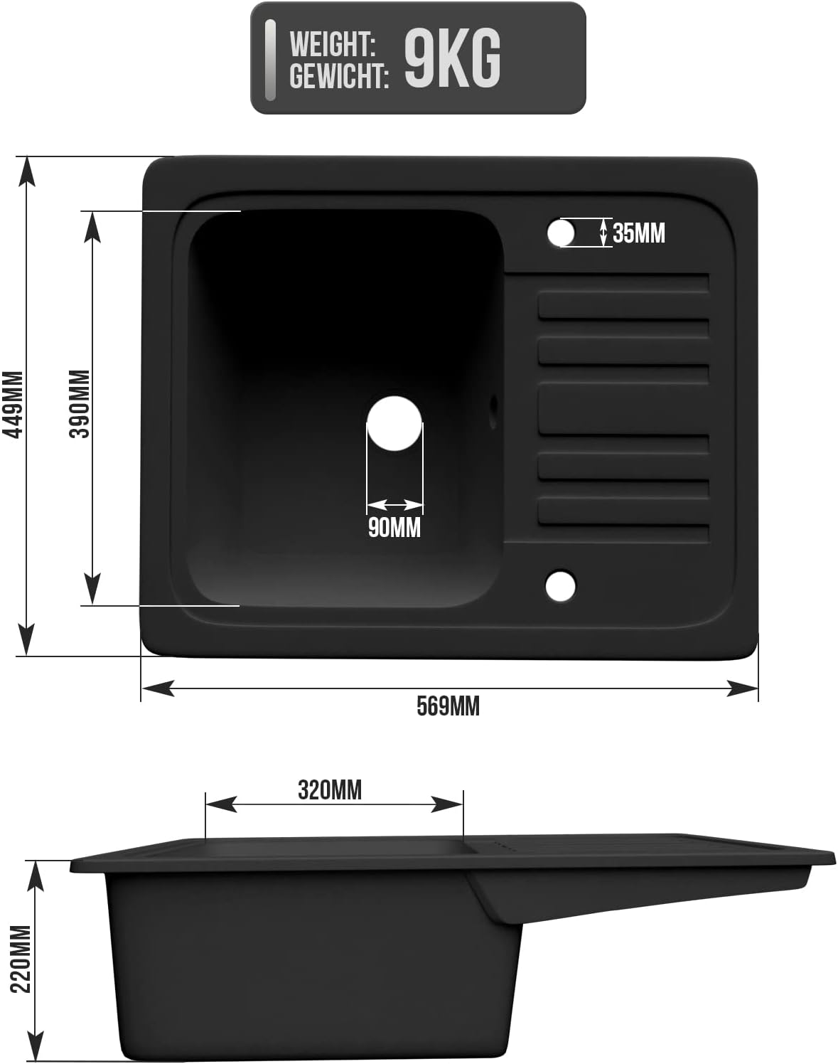- Eenvoudige montage: de gootsteen met omkeerbaar afdruipvlak en twee voorgeboorde kraangaten wordt geleverd met een installatie-instructies, een praktische uitsparingssjabloon, een afvoergarnituur en een kraan