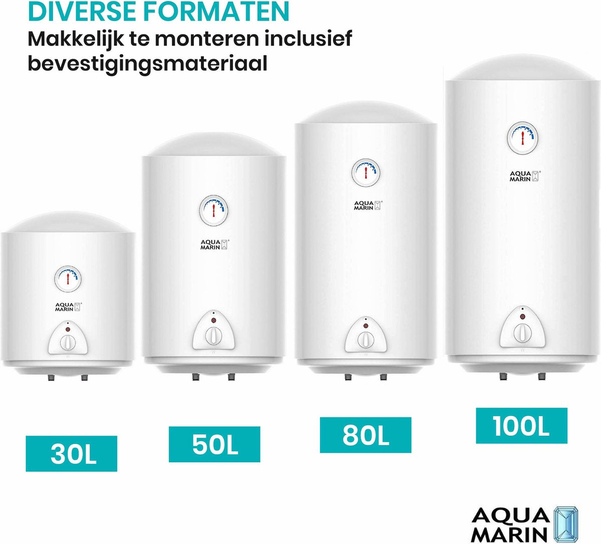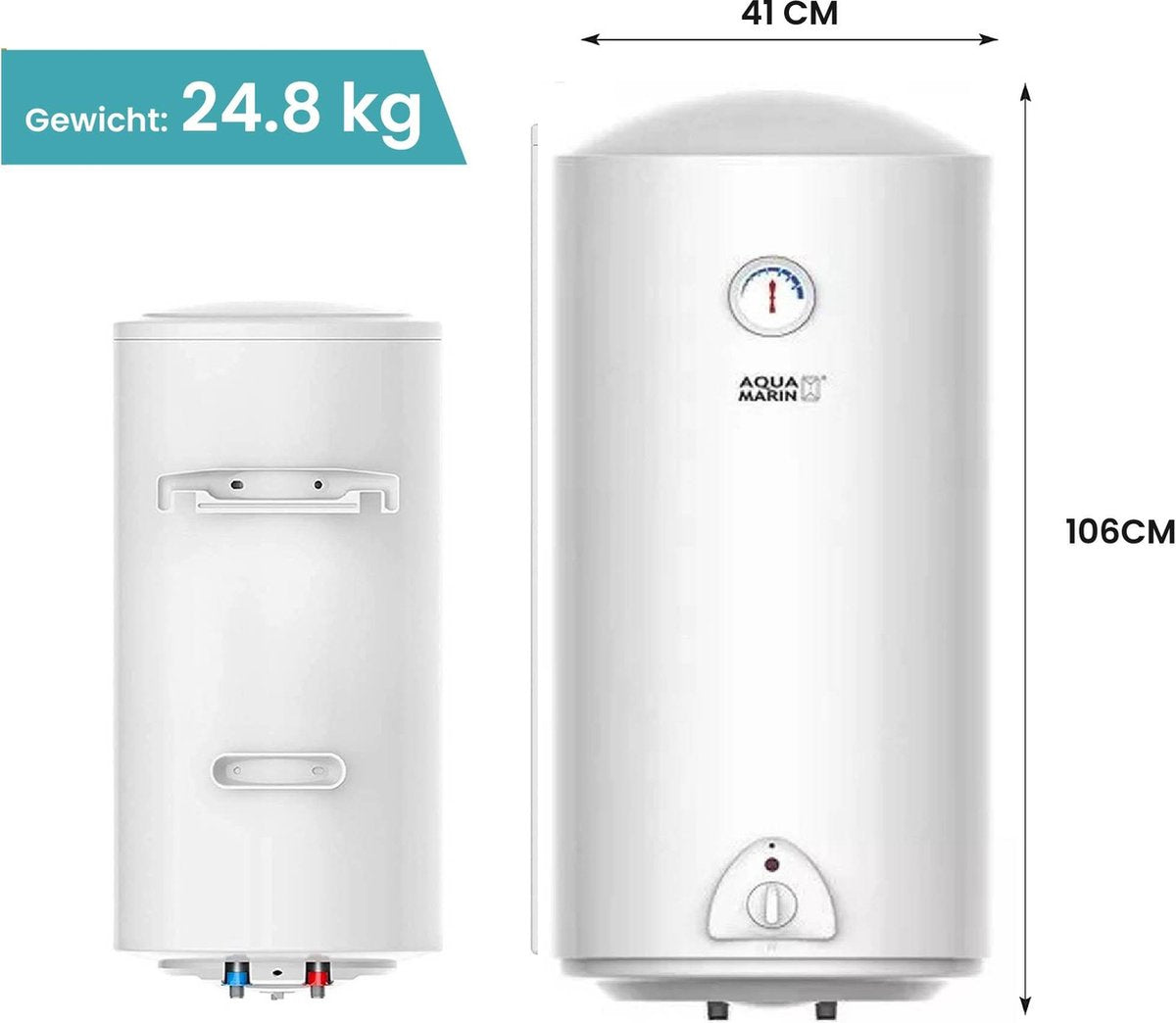 De Aquamarin boiler is voorzien van antikalk laag en is de perfecte warmteboiler tot 75 °C, daarbij heeft hij een inhoudscapaciteit van 100 liter, waardoor deze ideaal is voor een gezin van 4 tot 5 personen. De boiler heeft een formaat van 111 x 41 cm en weegt 27.8 kg. Bovendien is de boiler uitgerust met een erosiebestendige container, wat slijtage voorkomt en gegarandeerd zorgt voor een lange levensduur. Door de geïntegreerde thermostaat aan de binnenkant kun je de temperatuur eenvoudig controleren en naar wens instellen.