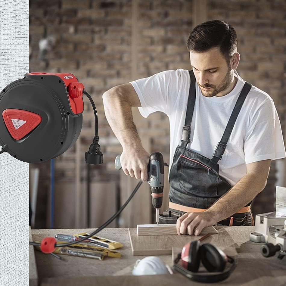 Efficiënt werken in werkplaatsen in de tuin of thuis. Praktische kabelhaspel voor wandmontage met automatische oproling. Met deze robuuste 180° draaibare kabelhaspel is orde op de werkplek. Het raakt niet in de knoop en raakt niet. En door de schone plaatsing van de stroomkabel wordt een lange levensduur gegarandeerd. De montage aan de muur gebeurt met de meegeleverde pluggen en schroeven. De trommel wordt gemonteerd geleverd en is direct klaar voor gebruik.