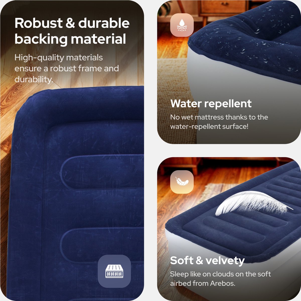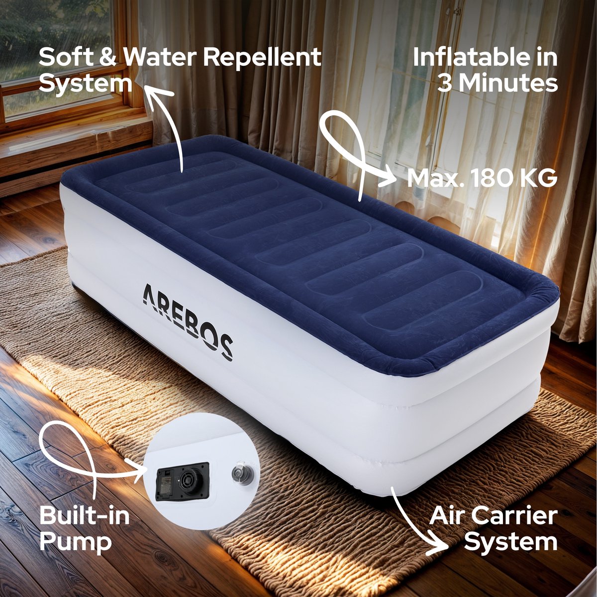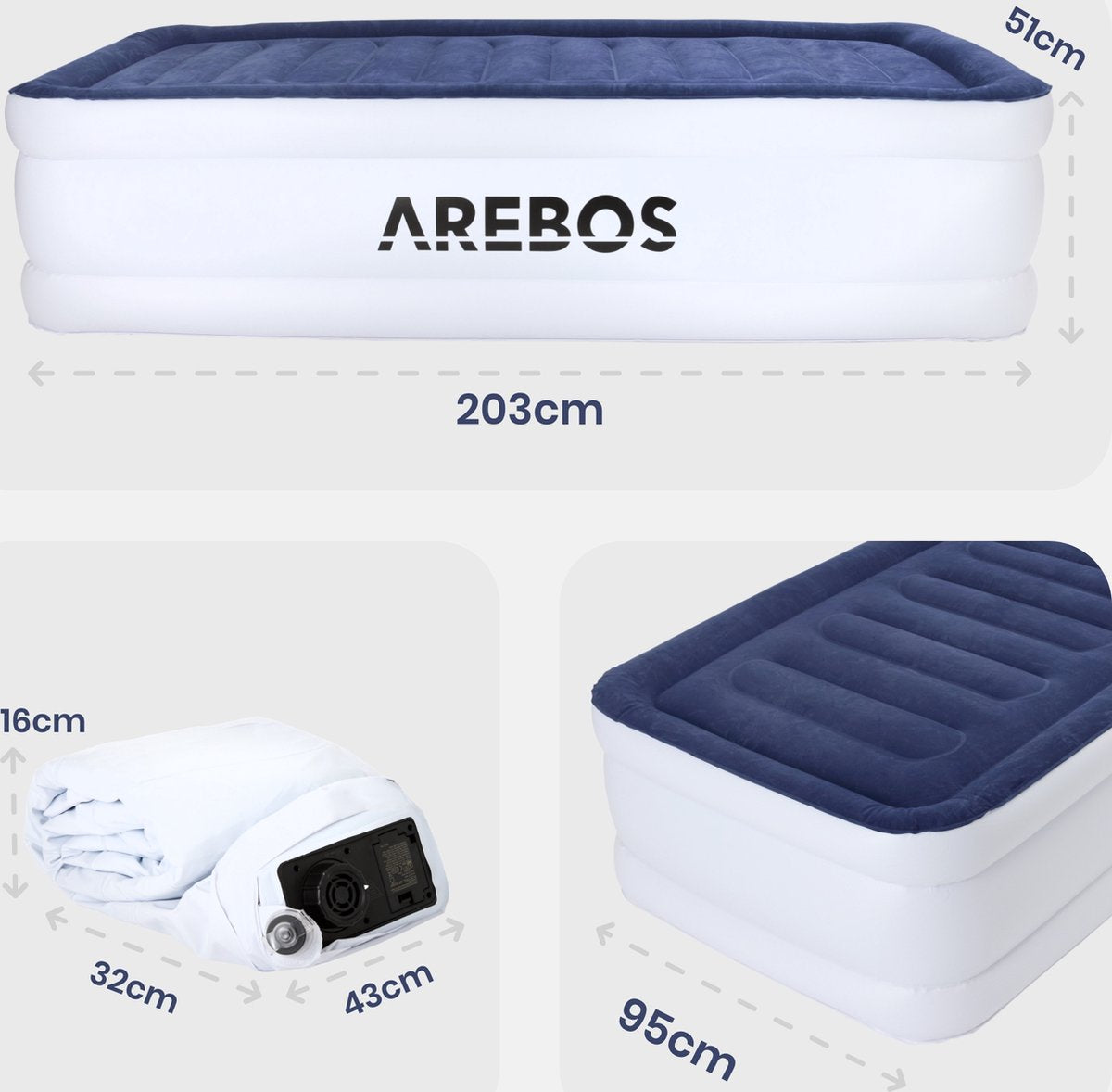 Het luchtbed van AREBOS is groter en stabieler dan gewone luchtbedden. De luchtbedden van AREBOS zijn speciaal ontworpen voor een comfortabele en rustgevende slaap dankzij het nieuwe type PVC.