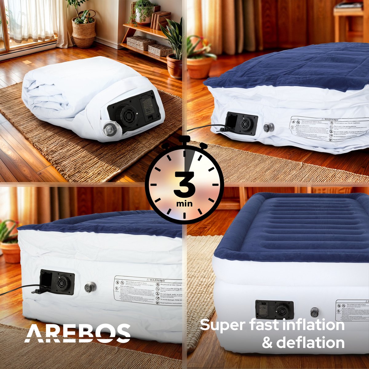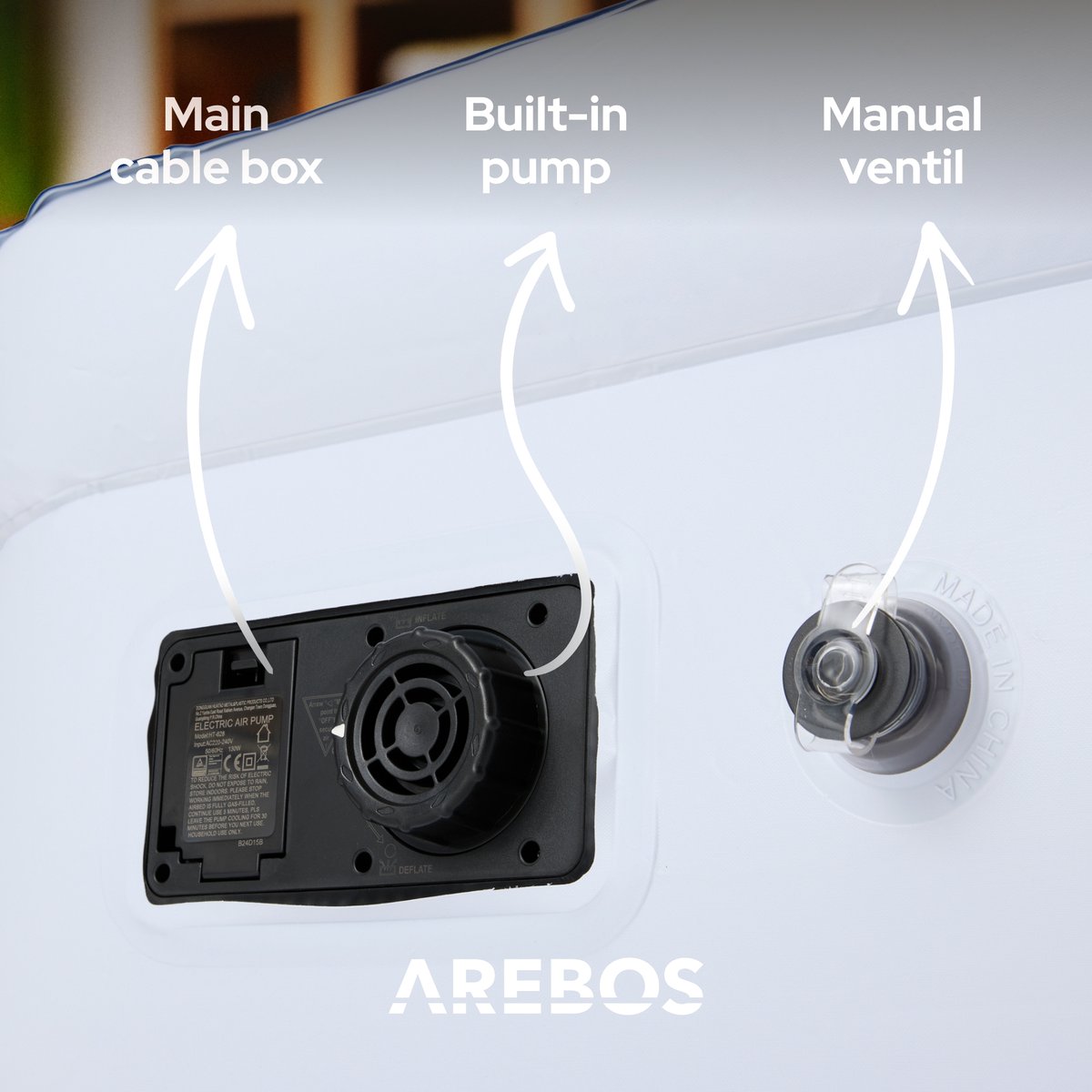 Het AREBOS luchtbed heeft een ingebouwde elektrische pomp, dus je hoeft hem alleen maar aan te sluiten en de pomp aan te zetten - het luchtbed blaast zichzelf in een paar minuten op. Zo creëer je in een paar minuten een fijne slaapplek op de camping, op je logeeradres of voor overnachtende gasten. Bovendien is er een handmatig luchtventiel geïntegreerd voor het opblazen en leeg laten lopen als de elektrische pomp niet goed werkt of als er geen stopcontact binnen handbereik is.