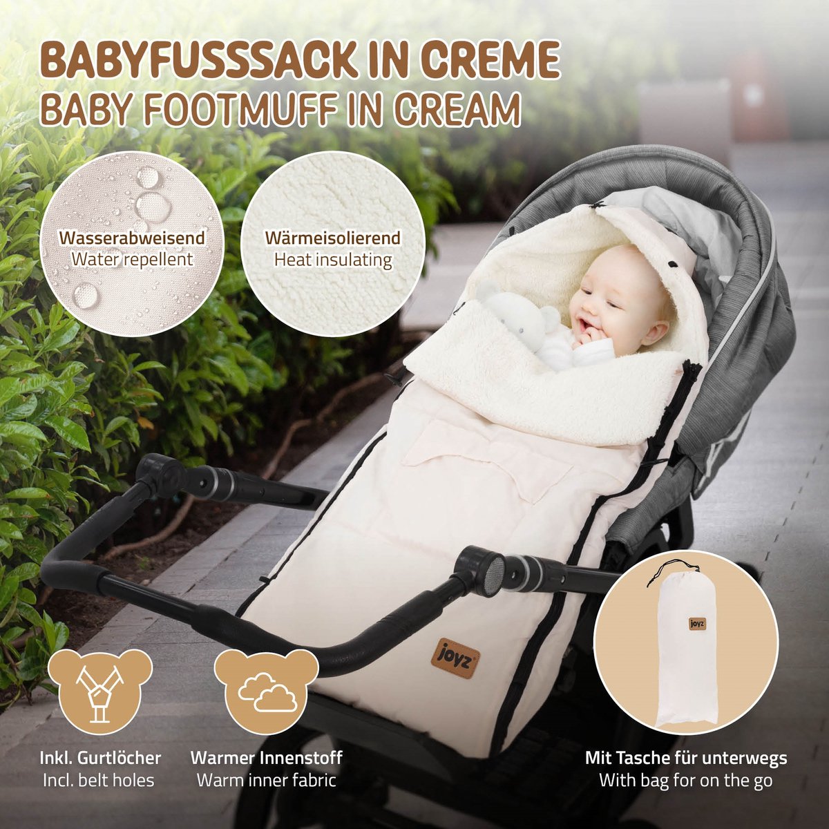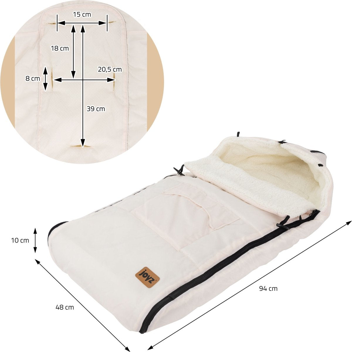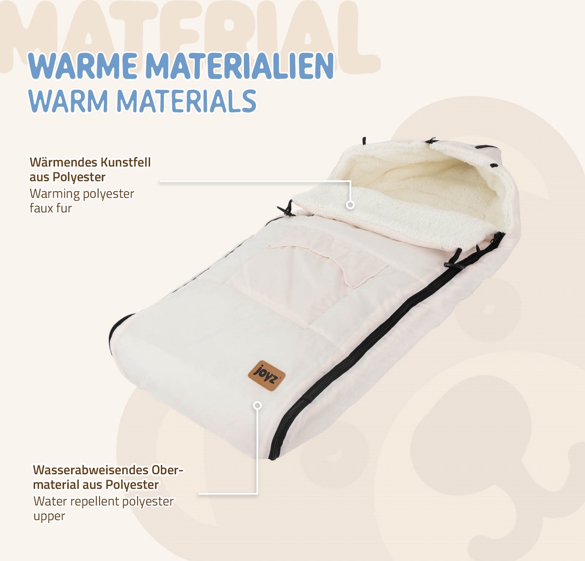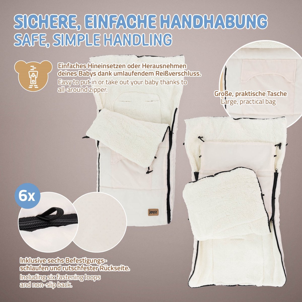 Jouw baby, altijd behaaglijk: onze babyvoetenzak is perfect ontworpen om jou en je baby te omringen met behaaglijke warmte. De zachte binnenvoering creëert een behaaglijke omgeving waar je lieveling zich veilig voelt. Weerbestendig en waterafstotend: Of het nu regent of sneeuwt, onze baby voetenzak trotseert de elementen. De waterafstotende buitenlaag houdt vocht buiten en houdt je baby comfortabel droog. Veiligheid is een topprioriteit: Dankzij onze slimme sleuven is de baby voetenzak ideaal voor autoritjes, kinderwagenzitjes of buggy's. Met de sleuven kun je het harnas stevig vastmaken in het 5-punts systeem en je baby onderweg optimaal beschermen. Geen wegglijden: We hebben aan alles gedacht! De antislipnoppen aan de achterkant van de voetenzak zorgen ervoor dat hij zelfs tijdens drukke momenten op zijn plaats blijft - voor extra veiligheid. Praktische zak voor jou: De ruime zak aan de voorkant biedt je extra opbergruimte. Perfect om de favoriete waterfles van je baby bij de hand te houden of andere kleine benodigdheden veilig op te bergen. Veelzijdig: Warm ingepakt of met meer frisse lucht - onze baby voetenzak past zich flexibel aan je behoeften aan. Onze baby voetenzak met rits is niet zomaar een product, maar een investering in het welzijn en de veiligheid van je kind. Geef je baby de liefde, bescherming en het comfort dat hij verdient - bestel vandaag! Koop hem nu en geef je baby de luxe van veiligheid en comfort. Bestel onze baby voetenzak met al deze fantastische functies en maak onvergetelijke wandelingen voor jou en je kleine wonder!