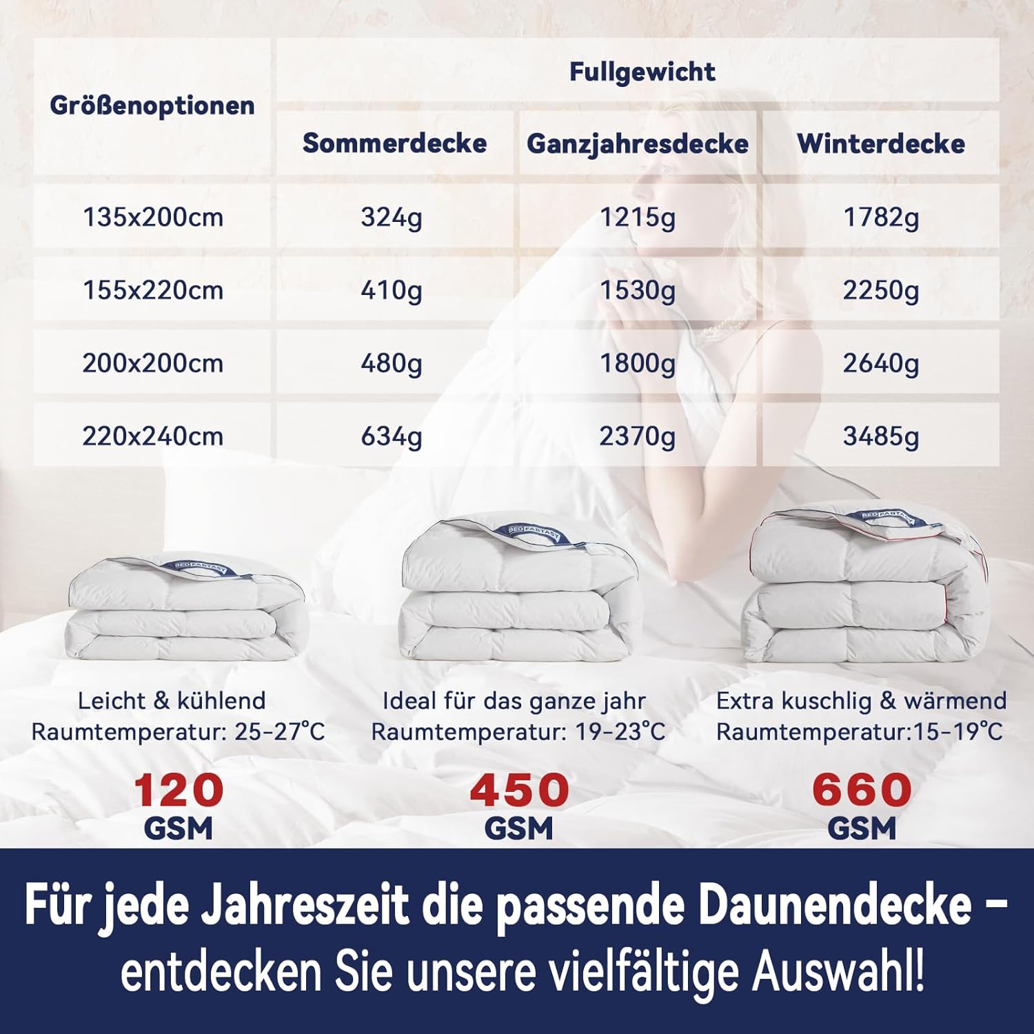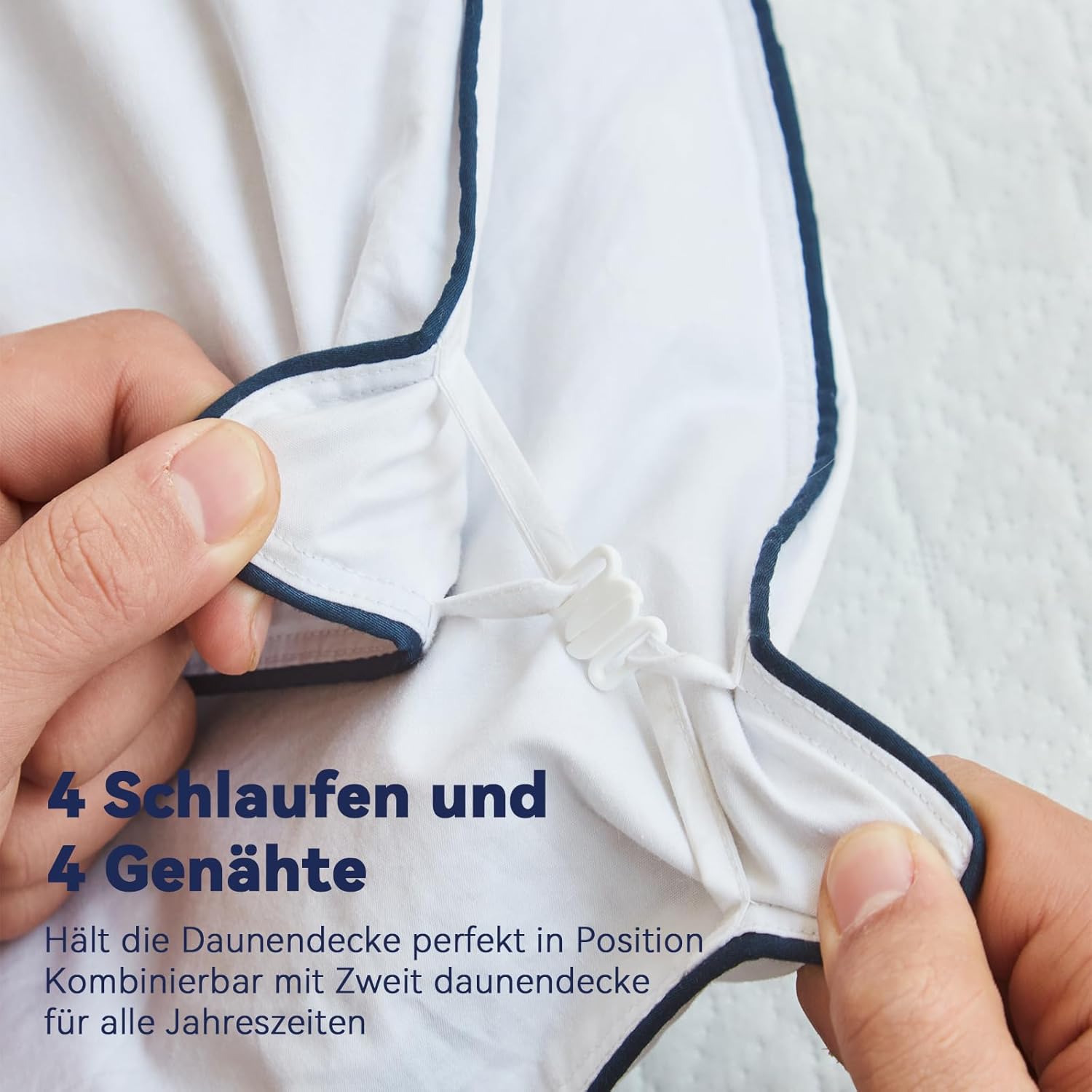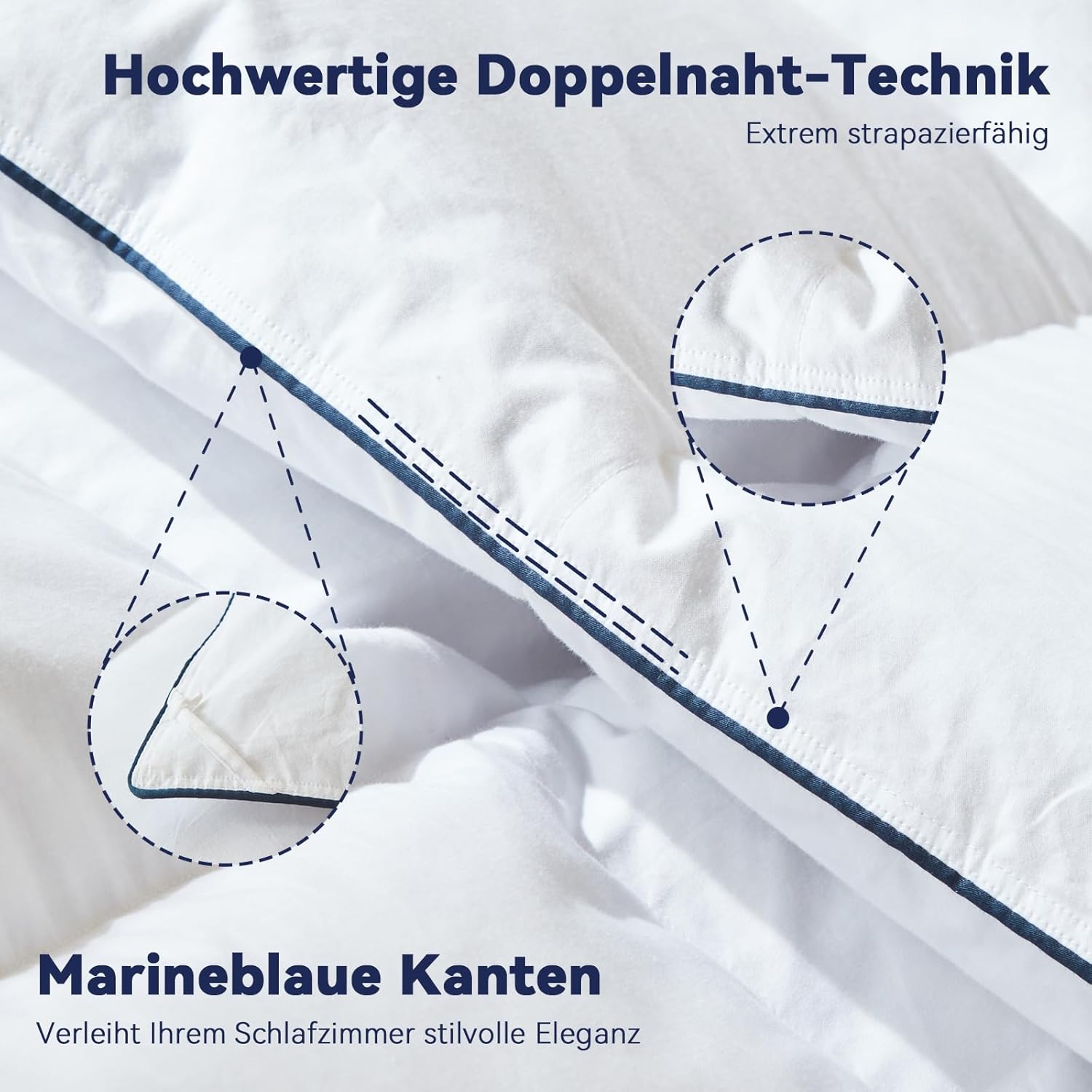 Prachtige details: de innovatieve 3D-kamerconstructie houdt de vulling gelijkmatig en klontervrij en zorgt voor optimale isolatie. 8 hoeklussen houden het dekbed perfect op zijn plaats en kunnen in elk seizoen met een tweede dekbed worden verbonden. De hoogwaardige dubbele naden voorkomen effectief het uitsteken van veren. Marineblauwe randen geven je slaapkamer stijlvolle elegantie