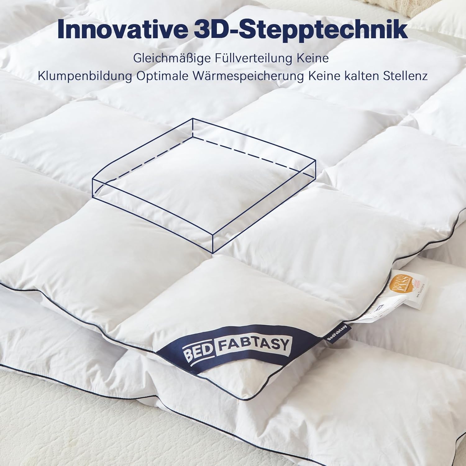 Veiligheidscertificaat: het donsdekbed van BedFabtasy is gecertificeerd volgens Responsible Down Standard (RDS), Down PASS en Oeko-Tex Standard 100. Premium materiaal garandeert een hoge zuiverheid, geurloos, geluidsarm en huidvriendelijk ganzendons. Zorgt voor een ontspannen, comfortabele en nachtrust