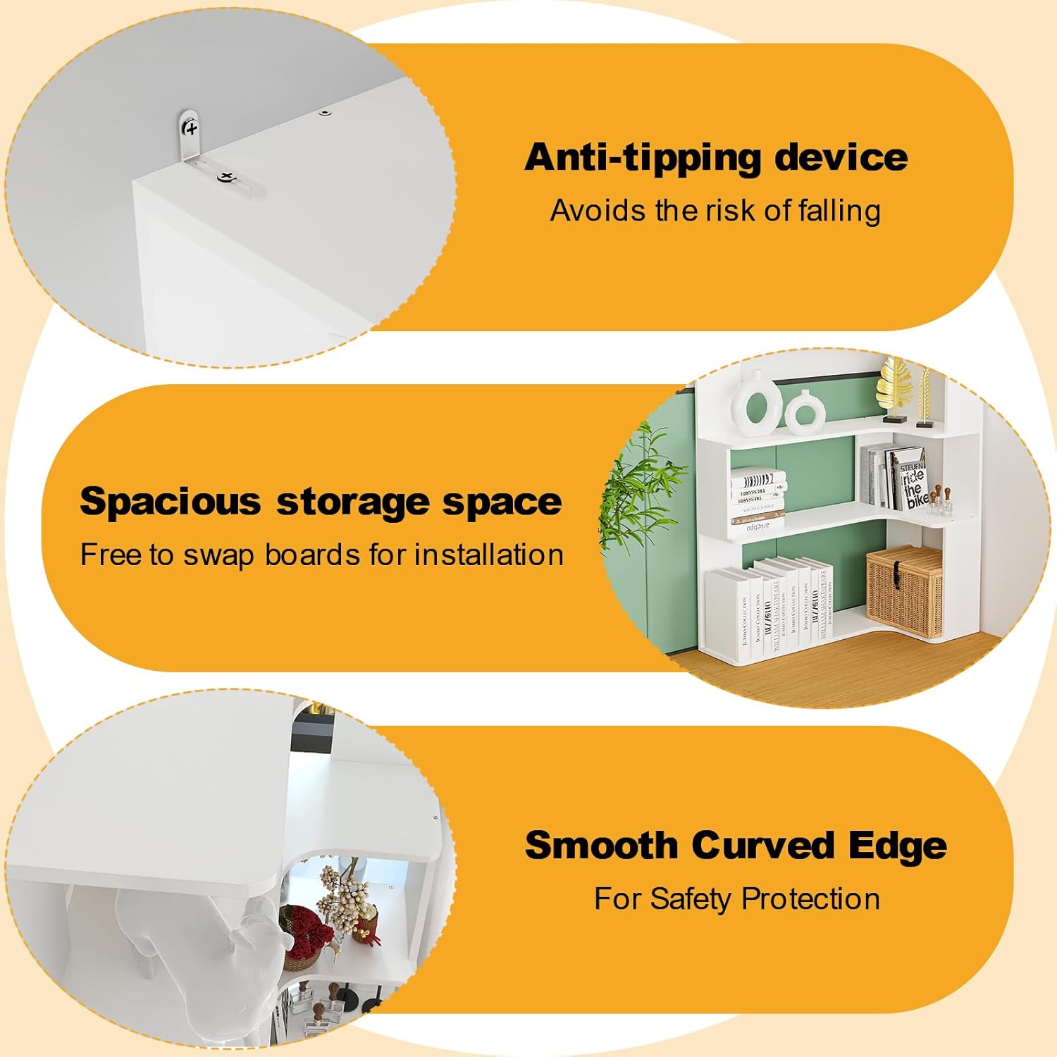 【Optische aantrekkingskracht toevoegen】De gladde, afgeronde randen beschermen jou en je gezin tegen krassen. De rechthoekige achterkant van het grote hoekrek is ontworpen in een hoek van 90 graden en past perfect bij de hoek van de muur. De in elkaar grijpende lamellen aan beide zijden voorkomen niet alleen het vallen van voorwerpen, maar versterken ook de artistieke charme van het hoekrek en verbeteren de gelaagdheid van de ruimte.