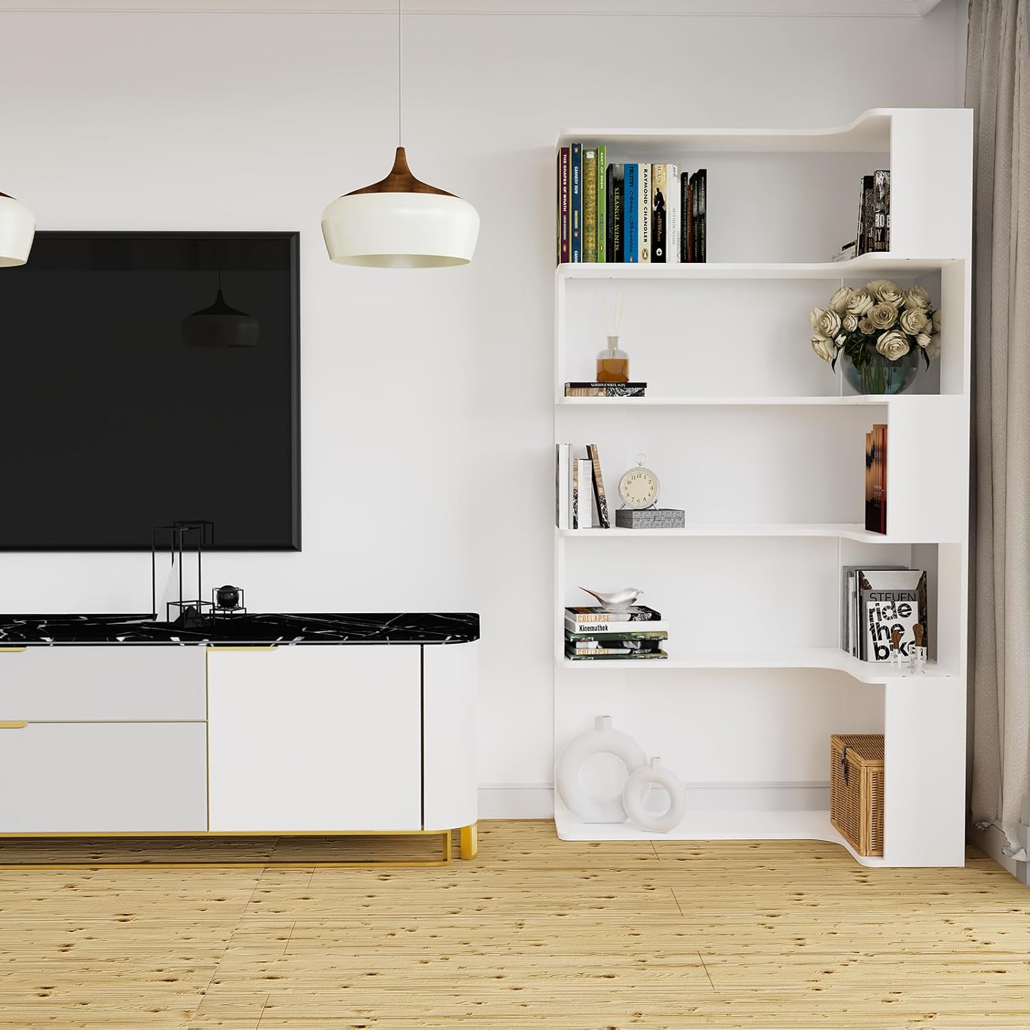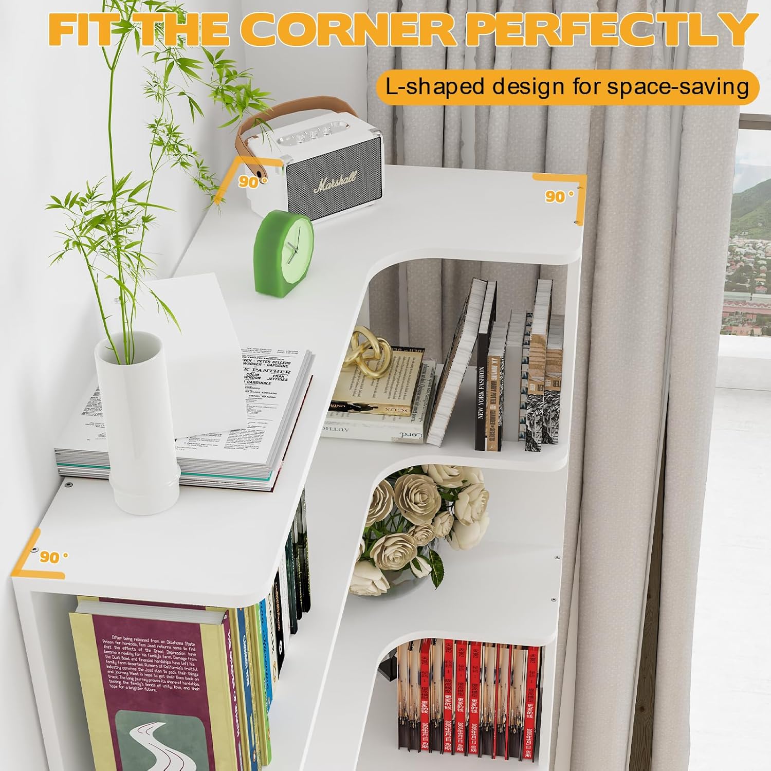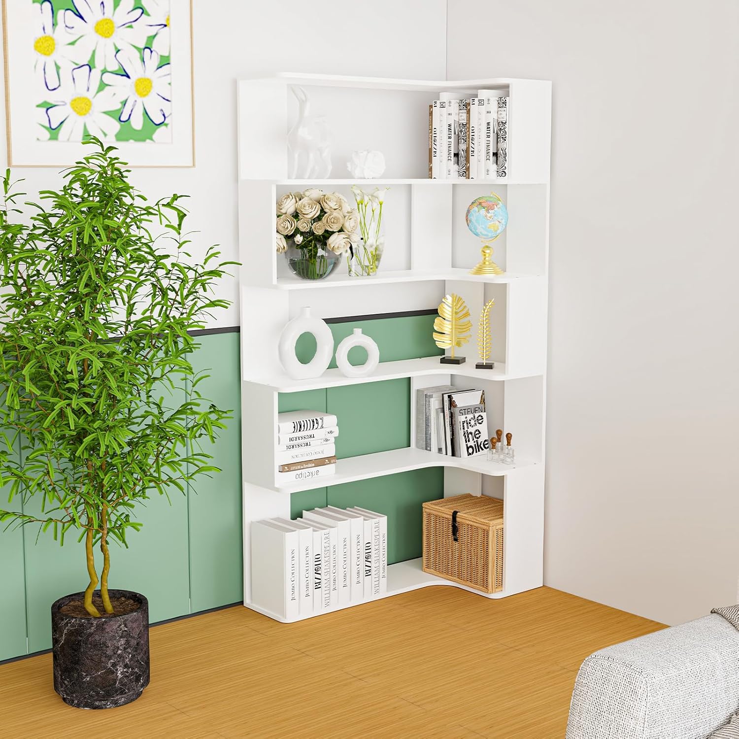 Boekenkast, hoekboekenkast met 5 niveaus, staand rek, kantoorplank, vrijstaand decoratief rek, voor presentatie, ruimteverdeler voor woonkamer, slaapkamer, kantoor, wit, 90 x 48 x 169 cm