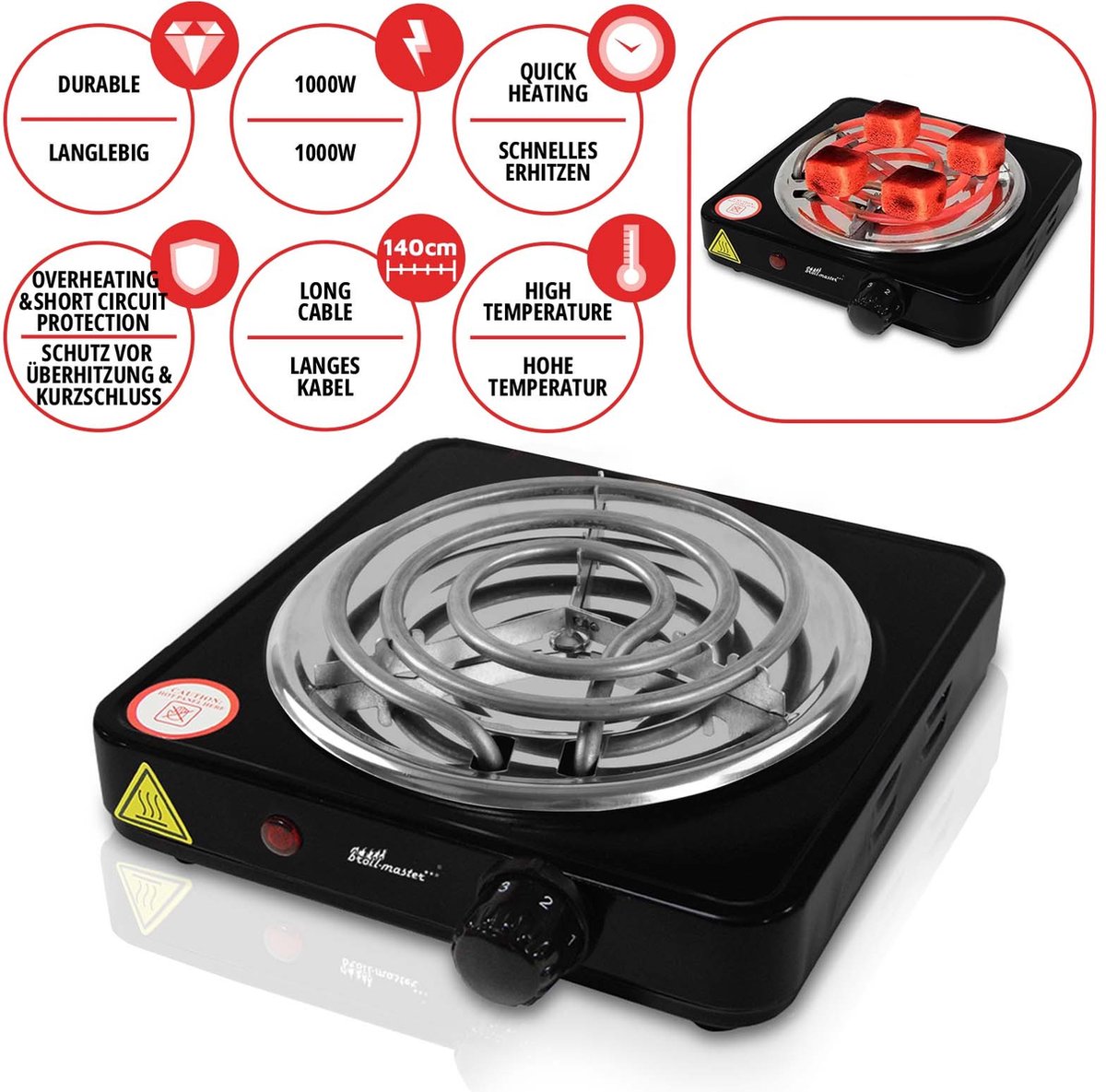 Technische gegevens: Afmetingen (L / B / H): ca. 22 / 24,5 / 7 cm Gewicht: ca. 0,77 kg Vermogen: 1000 W Voltage: 220/230 VAC 50/60 Hz Diameter plaat: ca. 140 mm Kabellengte: 91 cm Rubberen voetjes (H): ca. 15 mm Materiaal: gepoedercoat ijzer, VDE stekker Kleur: Zwart