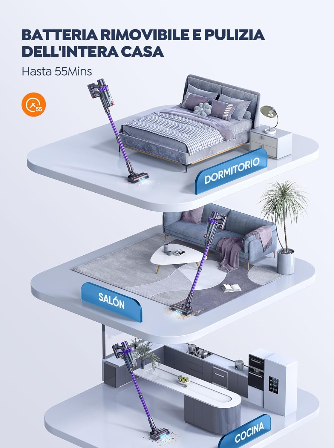 - Deze draadloze steelstofzuiger is uitgerust met een accu met hoge capaciteit. Eenmaal volledig opgeladen kan hij 55 minuten continu werken met minimale zuigkracht, zodat je een gebied van maximaal 200 vierkante meter kunt reinigen. Bovendien biedt hij 20% meer gebruiksduur in vergelijking met andere stofzuigers. Het volledige oplaadproces duurt slechts 4 uur en zorgt voor een snelle terugkeer naar de effectieve reiniging van je huis.
