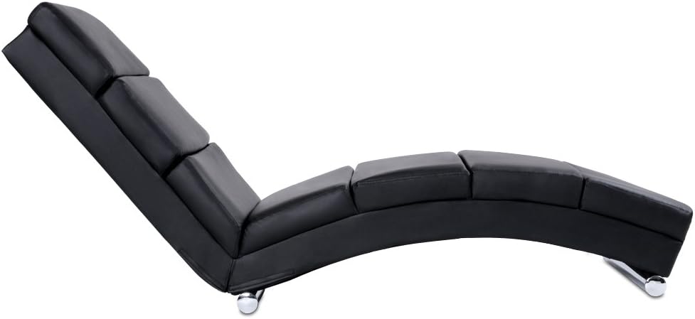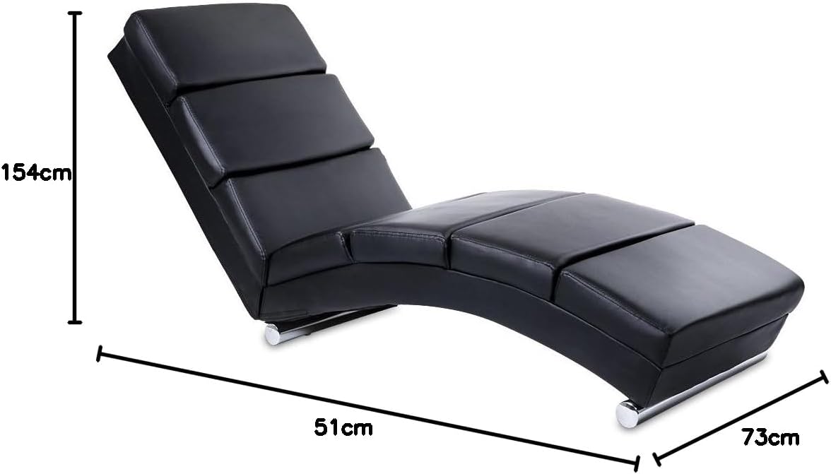 Gun jezelf een time-out De stijlvolle relaxstoel van zwart kunstleer nodigt uit om te ontspannen. Of het nu in de werkkamer, de serre of in de woonkamer is, het moderne design van de comfortabele ligstoel is een mooie blikvanger. Zeven zachte kussens zorgen voor een comfortabel ligoppervlak om uit te rusten en te ontspannen. De ergonomische vorm combineert een aangenaam liggevoel en een aantrekkelijke look. De optimale ligstoel om een goed boek te lezen, telefoneren te voeren of gewoon voor een klein dutje Licht rechtopstaande rugleuning en een gebogen ligvlak. Zeven zachte bekledingselementen maken ontspannen liggen mogelijk. Kleur: Zwart (kunstleer) Twee cilindervormige plinten (staal, verchroomd)